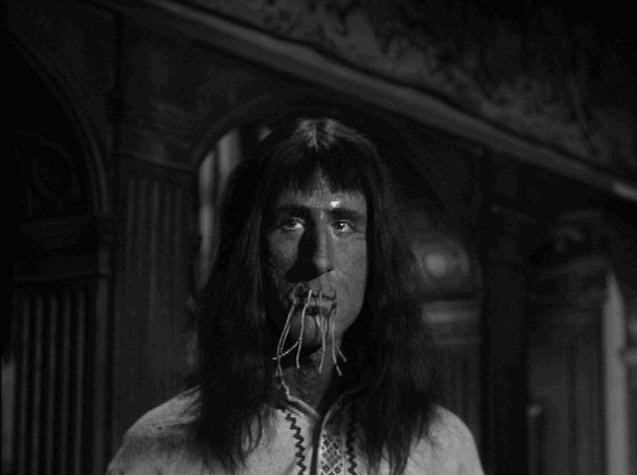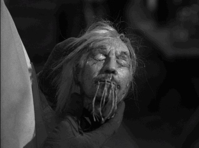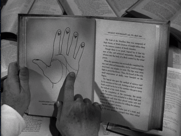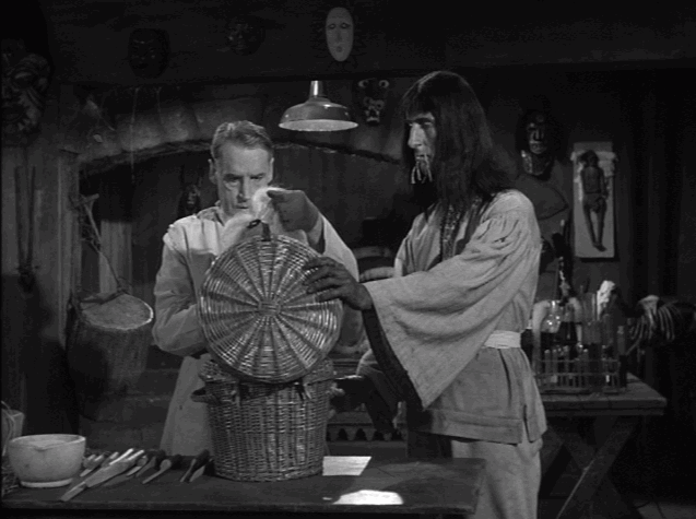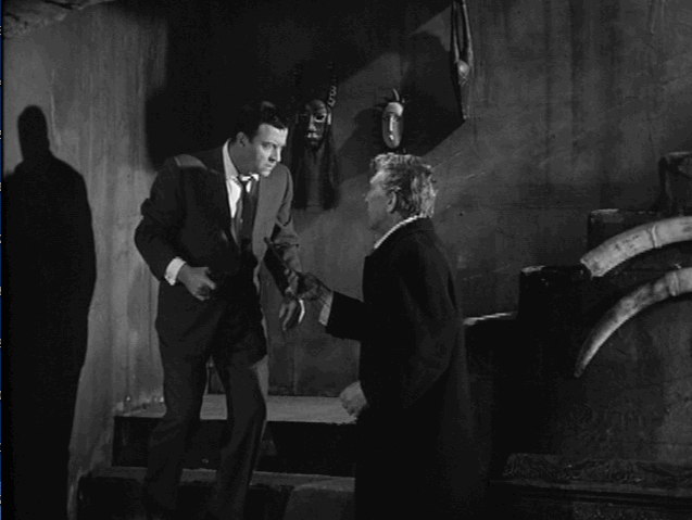 The film really has a nostalgic eeriness to it. It’s not one of the more significant vintage horror films of the 50s, but the appurtenances of voodoo shrunken heads, the skulls and poison darts, lips sewn together and the looming giant of a Zutai whose own lips have been stitched shut, looking for fresh heads to decapitate, and of course the sinister presence of Henry Daniell who is always fabulously droll, makes it one of my favorite Saturday afternoon or late Friday night treats. MG.