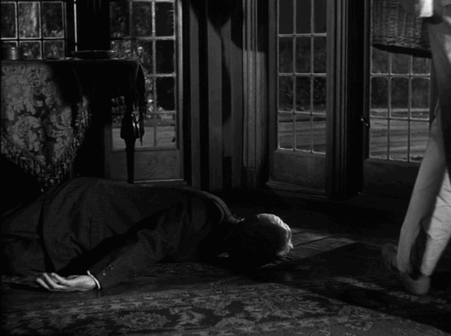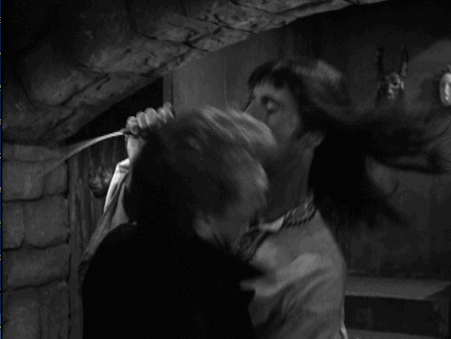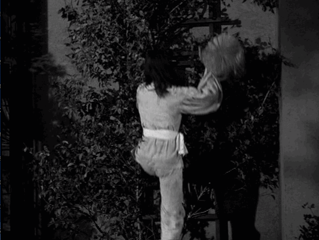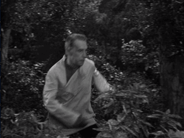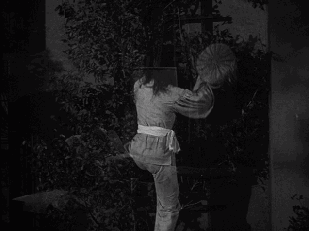 That night Zutai, the very imposing Zombie is sent to behead Kenneth. He climbs stealthily up the rose trellis. The creepy appearance of his lips sewed together with string, and wielding a poisonous curare-tipped bamboo knife gives the film its campy allure. Zutai doesn’t succeed in taking Kenneth’s head that night as he is interrupted by the butler and so he escapes into the garden and comes back for the head at the funeral parlor cutting Kenneth’s head off while in the coffin.