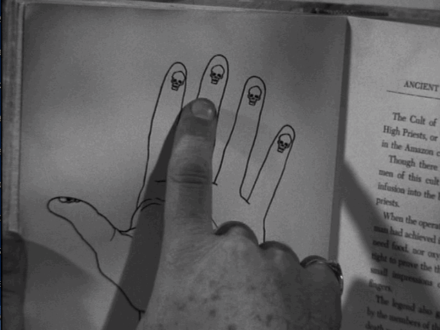 “Could one man have lived long enough to put all 3 skulls in there?” asks Lt Rowan to Dr Bradford who says “I know of no such case in medical history”Alison Drake finds a passage in one of the textbooks. “That’s it, that’s the way it appeared, the impression on the skulls.” We see 5 skull icons printed on the fingertips of a hand.