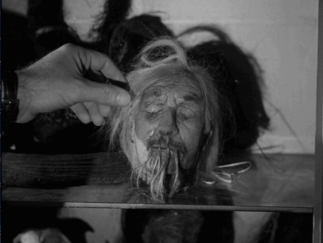 In the climax of the film, it is discovered that Dr. Zurich actually died 180 years ago and that he’s really the witch doctor from Ecuador using Dr. Zurich’s head as a disguise. The white man’s head has been mystically sewn atop the witch doctor’s brown Indian body, as we see the severed stitchwork on the neck between the white man’s head and the dark “savage” skin of the South American Jivaro witch doctor once his shirt is ripped open to expose the brown skin. Again, we have a theme where it’s us again them, the strange cultures that invade, beware of the savages, they’ll take your head! and even shrink it too!