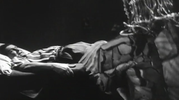 Lombardi puts Andrea in another deep trance. “I command you, leave your body!” Then as if birthed out of the churning briny ocean depth’s The She Creature materializes and begins lumbering (which monsters are apt to do in these things) up the pier steps.