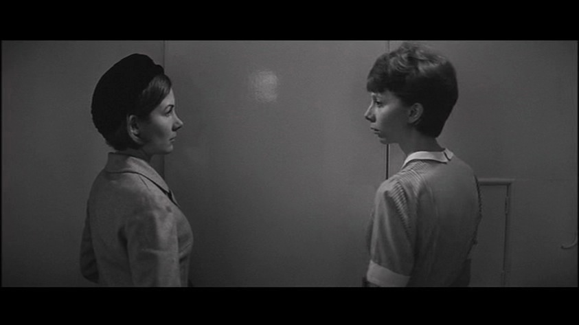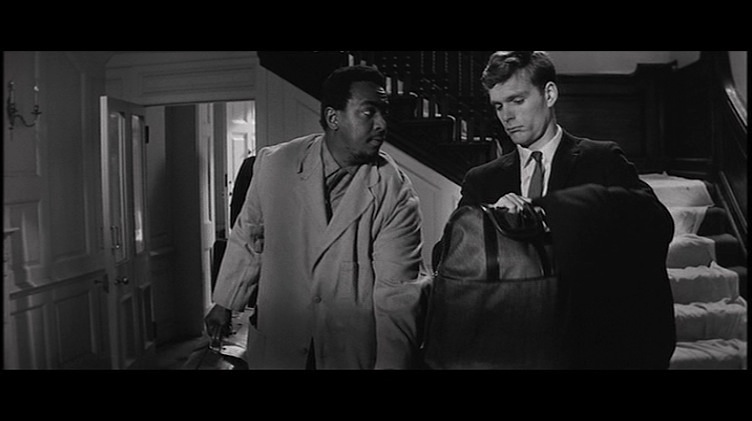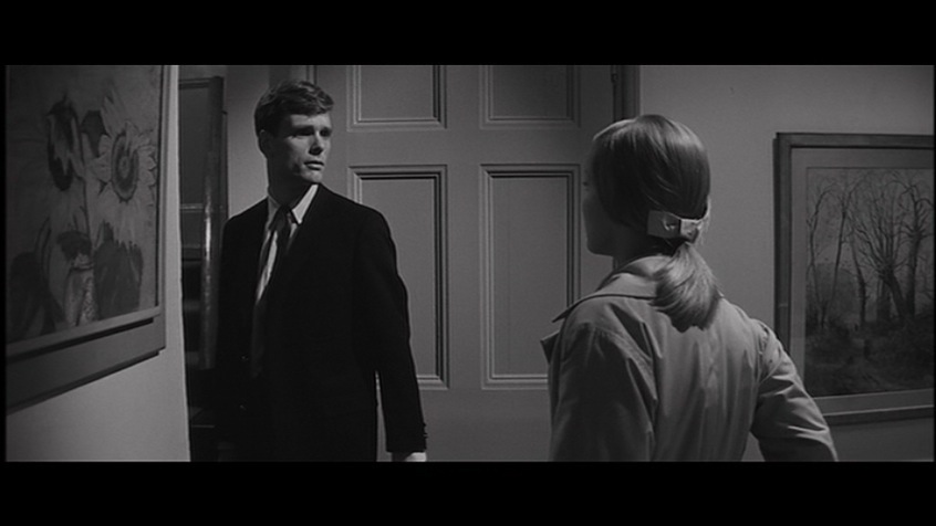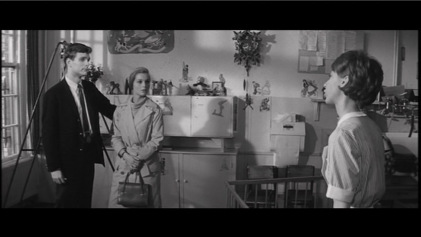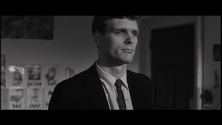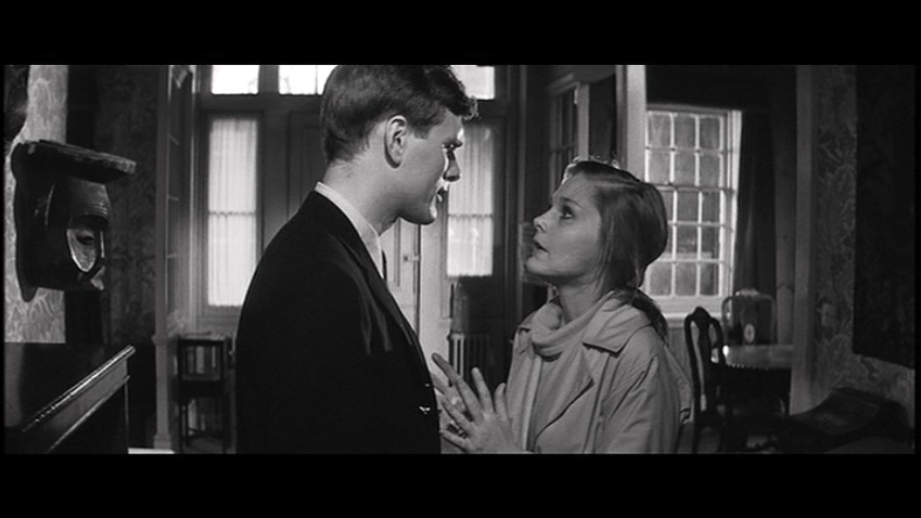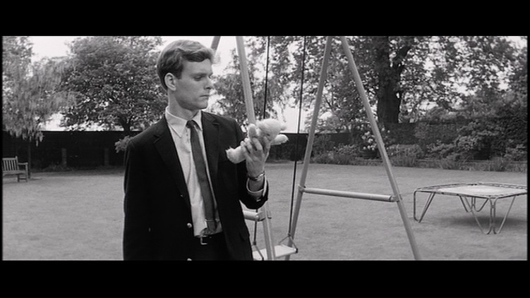 From the opening of the film, we are led in by the poignant childlike music and Saul Bass’s incredibly gestalt title sequence as Keir Dullea’s character Stephen Lake walks stiffly through a playground. At first, we see him in his perfectly pressed suit and neatly coiffed hair walking by a set of children’s swings, he then bends down to pick up a child’s stuffed toy. The black-and-white photography is crisp and bright and well-defined. Practically gliding into the lovely manor house, he closes the door behind him and locks it. The house has the appearance of being emptied out as it is in the process of a move. It is sparsely encumbered with the sense of vitality and spirit that fills a home, all the furniture is covered in sheets. One of the movers comes out of the back room, while Stephen puts the little stuffed animal in his briefcase. Paul Glass’s beautiful music is the only presence of sound in this quiet scene relating to movement, where there is a lot going on without a word being spoken. Visually we are being told that change is taking place. Yet the only signifier is Dullea’s character and his precise gesticulations within the brisk scene with his tying up the loose ends of the move. Brother Stephen seems to be the provocateur of closure. Even the symbol of his locking the doors, or picking up and putting away the child’s little toy. He is a serious-faced young man on a mission although we are closed out of his machinations as we are merely the spectator to his very deliberate actions.