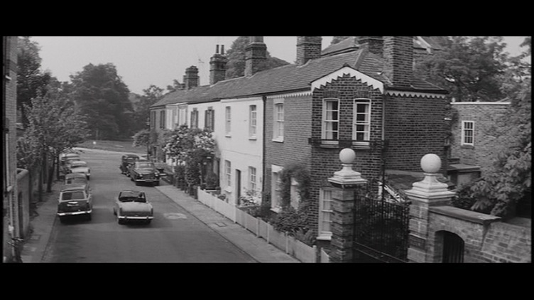 Stephen gets into his little convertible sports car, we specifically see the street sign on the wall, Frogmore End, he pulls away and leaves the small quaint street as the camera films him in the long view. This is the end of the opening sequence.