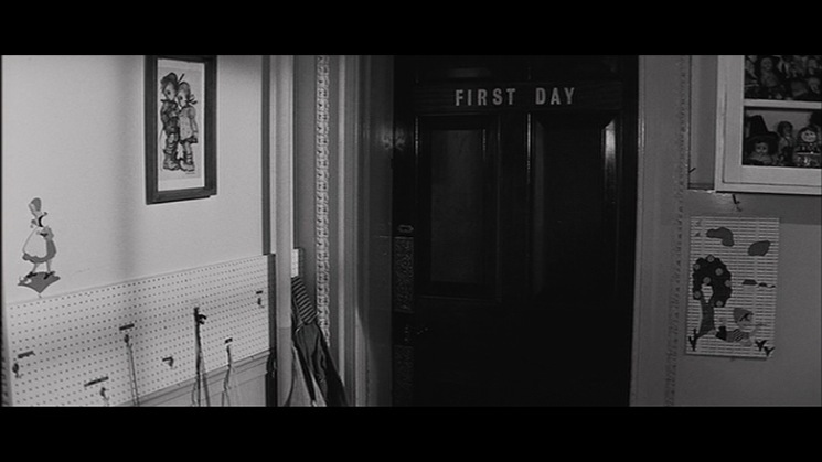 There’s a very quick flash to the next scene as the camera focuses on a door that says ‘First Day’ on it. It looks like a child’s school and we hear little children singing through the halls, perhaps behind the closed door. At once, Ann Lake (Carol Lynley) comes out of the room and looks into the Dining Room which is empty. We still hear the children singing some type of hymn.