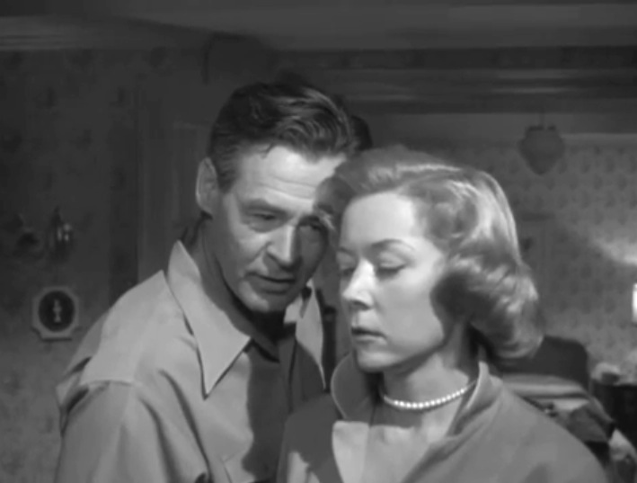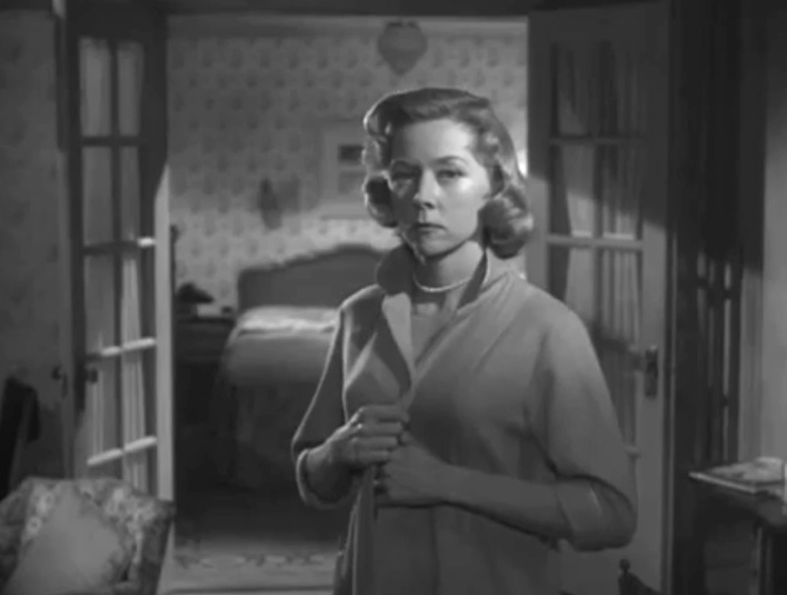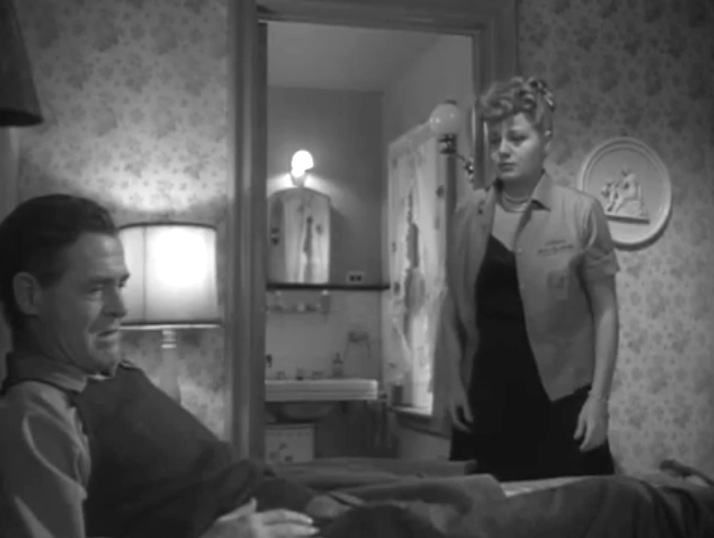 Earle lives with Lorry while she supports him, which works on his ‘masculine integrity.’ Picking up the dry cleaning and being asked to babysit the neighbor’s baby undermine his identity as a strong male. When Earle meets the enticing neighbor Gloria Grahame whose husband leaves her alone a lot, he’s abrupt as he answers the door bare-chested like an uncivilized brute sending her away.
