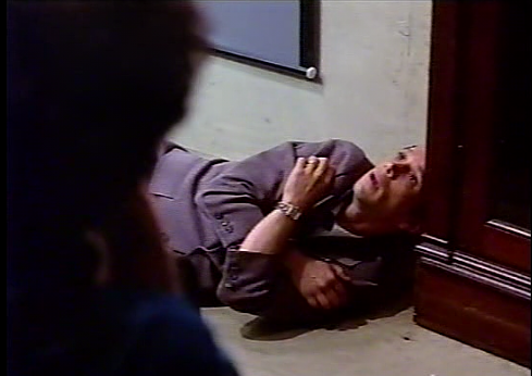 As Gill asks to speak to Morris Brummel, the camera frames the dead woman to the left of the screen as Gill is lensed to the far right, standing by the phone. He found his third victim. Morris says, “Speaking,” Gill answers, “Morris, this is Dorian (still in character) Dorian, Dorian Smith.”