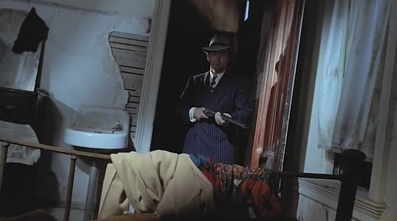 He takes Grace downstairs to see her father who is covered in a sheet. Marc Lawrence looks like a dessicated gangster by now but he’s got quite a huge list of credits best known for playing gangster types. He was also blacklisted in the 50s. Just look at some of his credits – Johnny Apollo ’40, The Monster and the Girl ’41, Hold That Ghost, This Gun for Hire ’42 The Ox-Bow Incident ’43, Dillinger ’45 Blonde Alibi ’46, I Walk Alone ’46, Key Largo ’48, Jigsaw ’49 The Asphalt Jungle ’50.