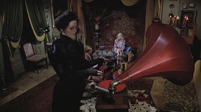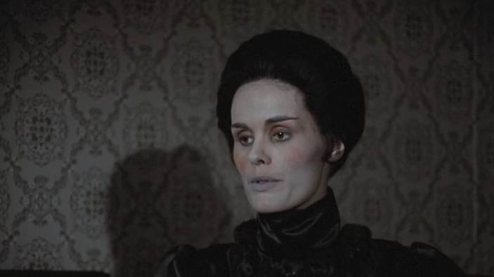 “If I wait any longer embalming would be impossible. The blood hardens.”“Don’t touch him.. he sat up… he wants my help.”The color palate and tones of the basement mortuary are purposefully dialed back to the drab industrial dark and dankness with a black-green tinge. Both the orphanage and this moment in Grace’s life symbolize the death of her spirit, the loss of her father.Grace’s father stabs the undertaker with the embalming vein tube, He dies slowly.