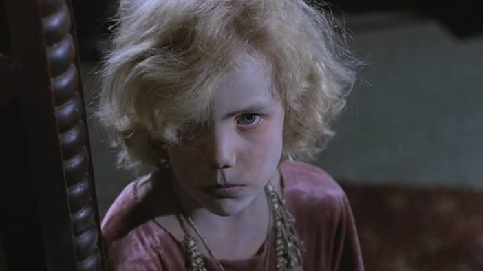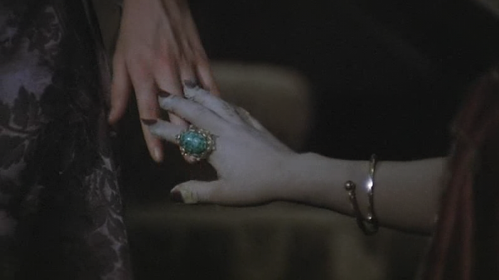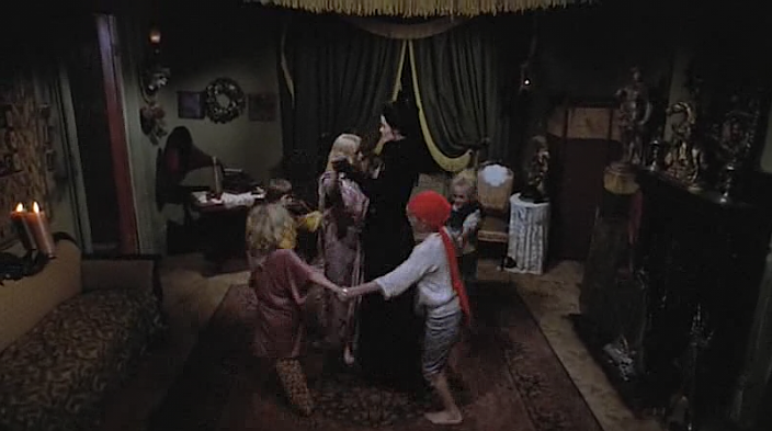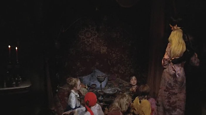 As the children sit around in a circle at Lila and Lemora’s feet, the deep strings or it could be a Melatron begins to play the most evocatively haunting melody line. Perhaps one of the most signature themes of the film. The poignant motif symbolizes Lila’s impending transformation while Lemora pours a goblet of blood into glasses.