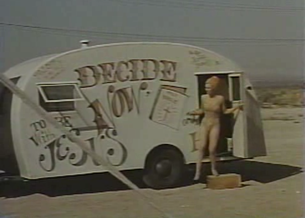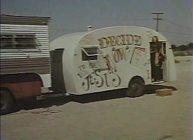 After the orphanage scene, it is later in years. We see a hippie-style camper that has been converted into more of a carnival sideshow vehicle that boasts DECIDE NOW TO BE WITH JESUS. Grace hesitates to come out in her strange skimpy costume pale metallic gold sequins and peach knit bathing cap. She looks like a 50s showgirl about to take a dip in the pool when she first comes out of the camper to show Jesse. She begins practicing her depth-defying high dive for the Lord representing the "˜fall to hell' as a grand finale to the show. She's grown up in the Bundy family and has now become the assistant to the Carny faith healer/preacher foster brother Reverend Jesse Bundy. Incidentally, Michael Pataki is primal in Dream No Evil, he was also great as a vampire in the way more impressive Grave of the Vampire by director John Hayes.