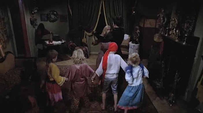 Lila Lee is met by more devilish urchins who cackle and claw at her as she ascends the dark wooden staircase of the Gothic house. The children themselves are a bit androgynous. For me, it is hard to tell if they are mostly girls or a few scattered boys. Their clothes, hair, and jewelry are quite gypsy but do not necessarily reveal this. An interesting gender twist is added to the plot.