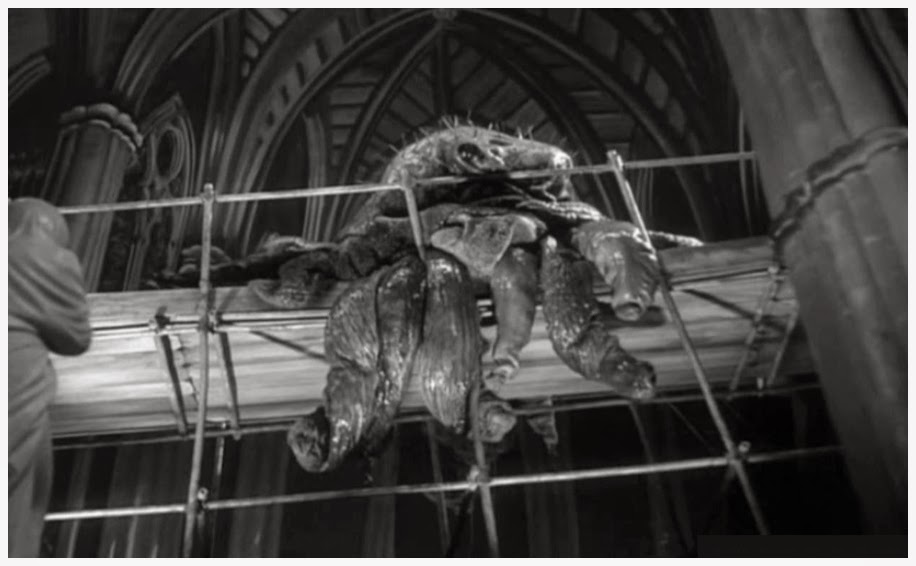 The beastly slave of the alien is a hand puppet created by the cheesy greatness that was Paul Blaisdell. (link to my tribute, The Tacky Magnetism of Paul Blaisdell)