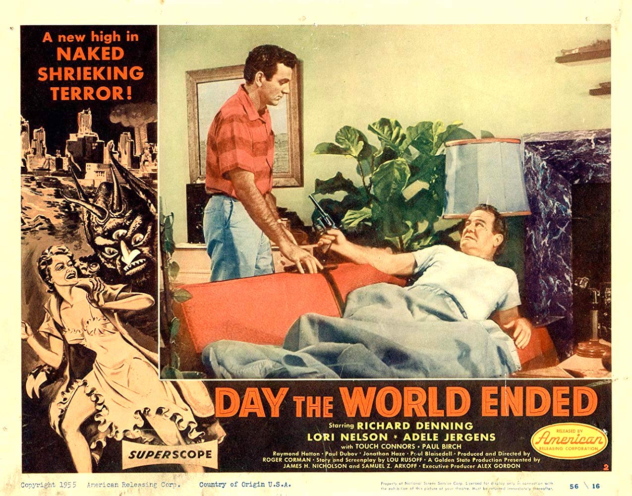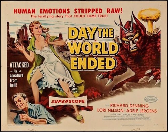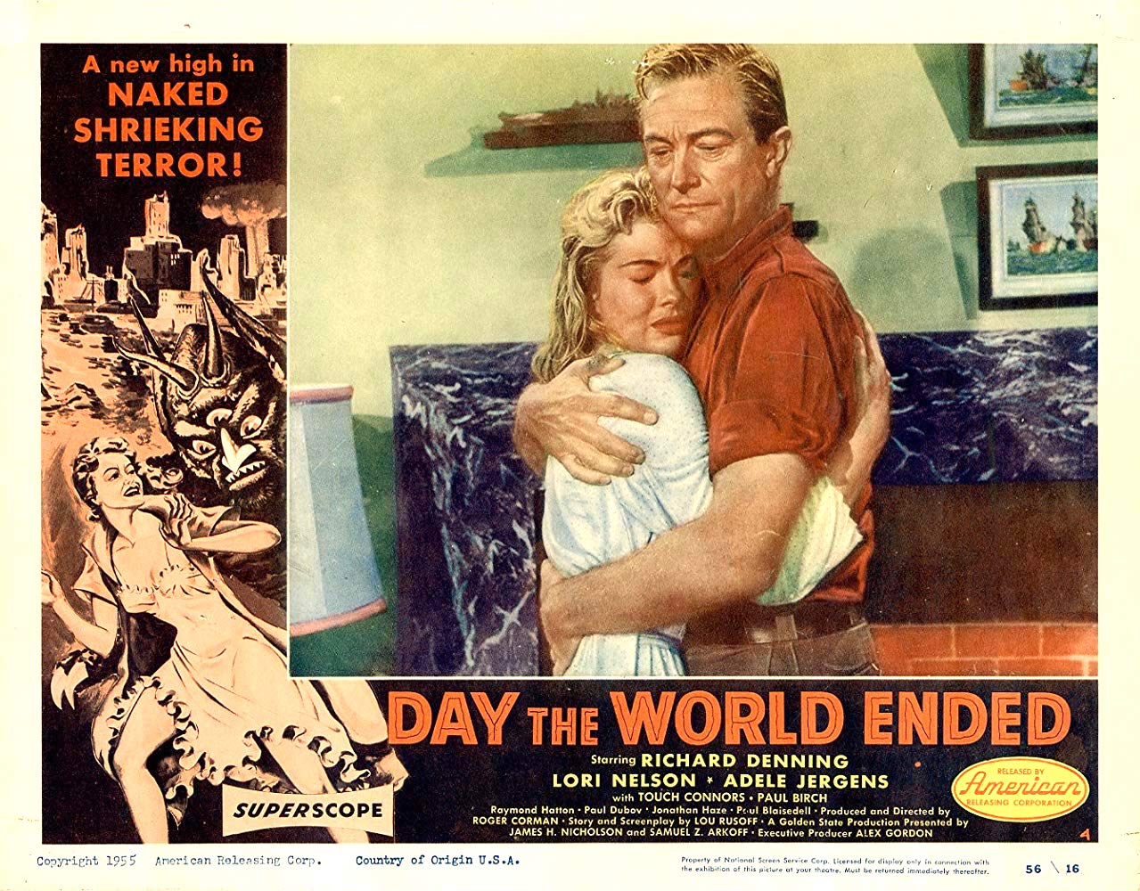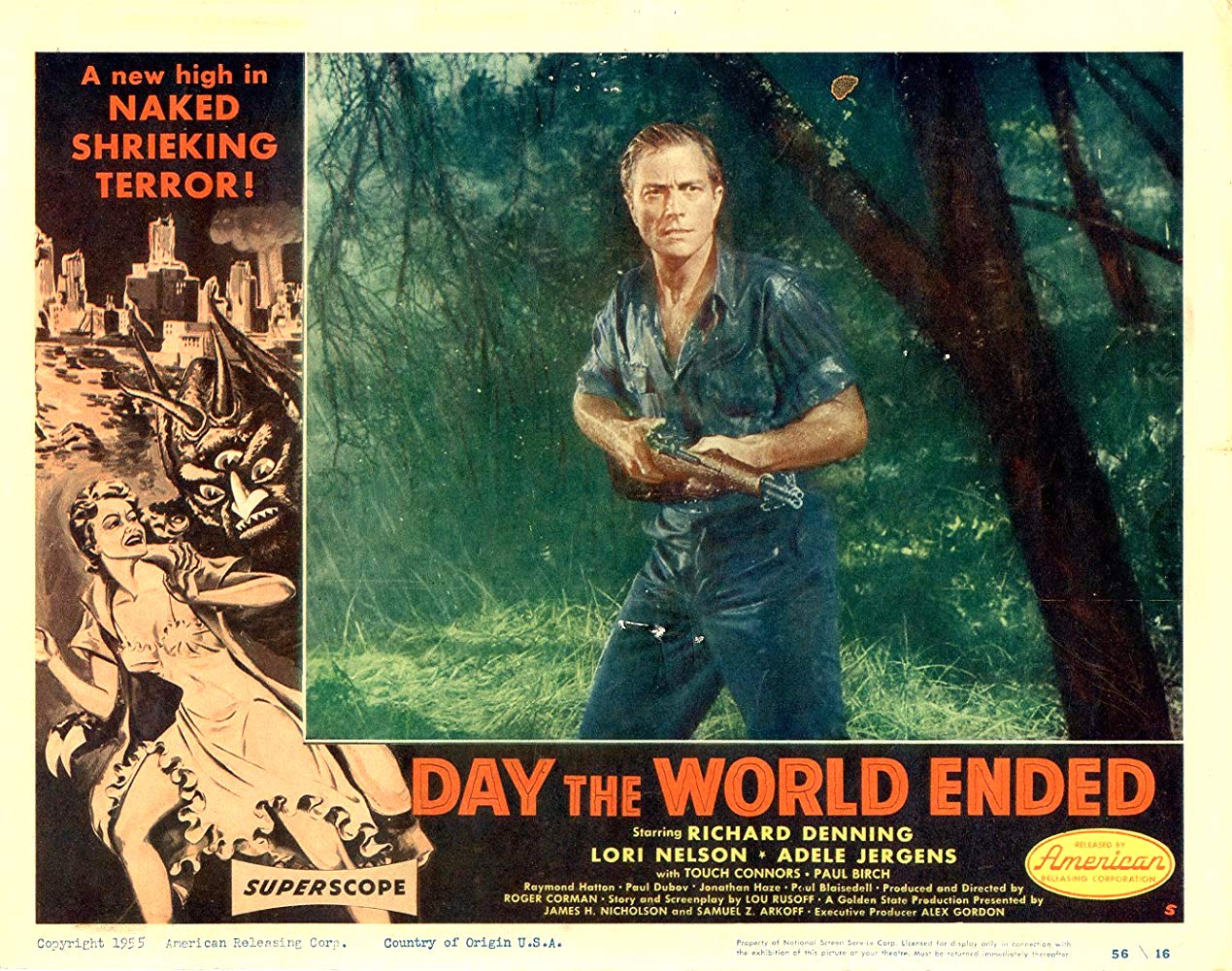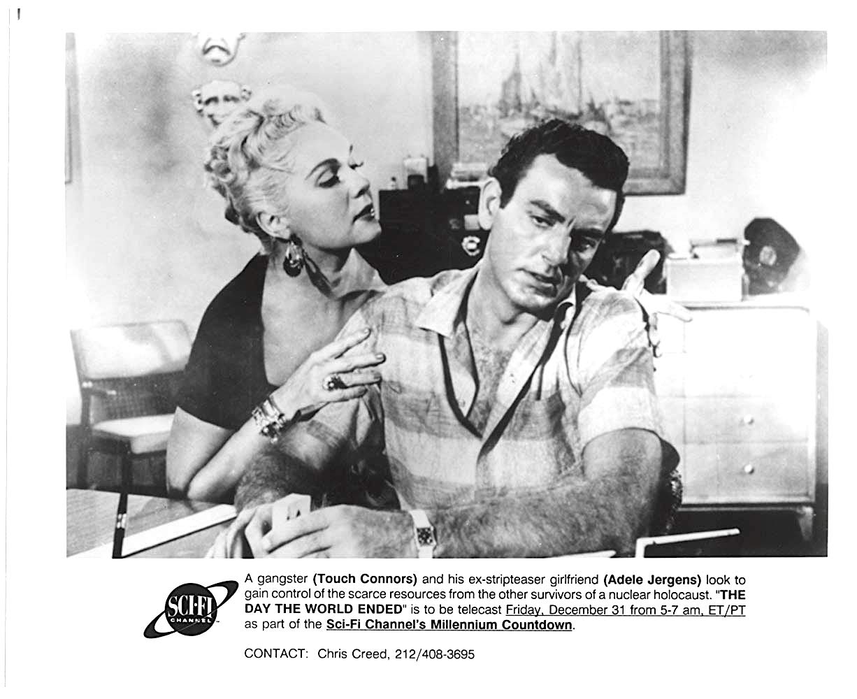 Day the World Ended stars Richard Denning as Rick, Lori Nelson as Jim’s daughter, Louise Maddison, Adele Jergens as Ruby, Mike Connors as gangster Tony Lamont, Paul Birch as survivalist Jim Maddison, Raymond Hatton as Pete, Paul Dubov as Radek, Jonathon Haze as Contaminated Man, and wonderful monster creator Paul Blaisdell as the mutant!