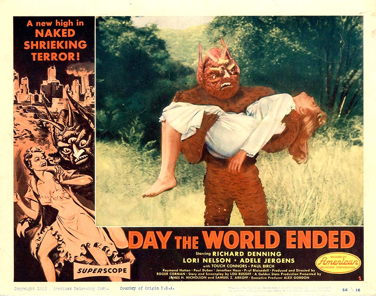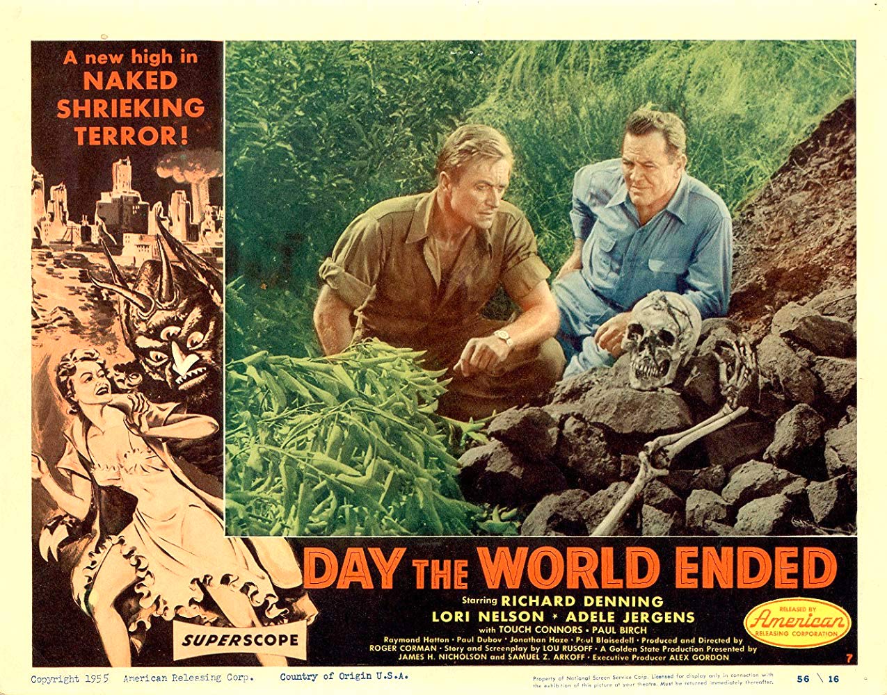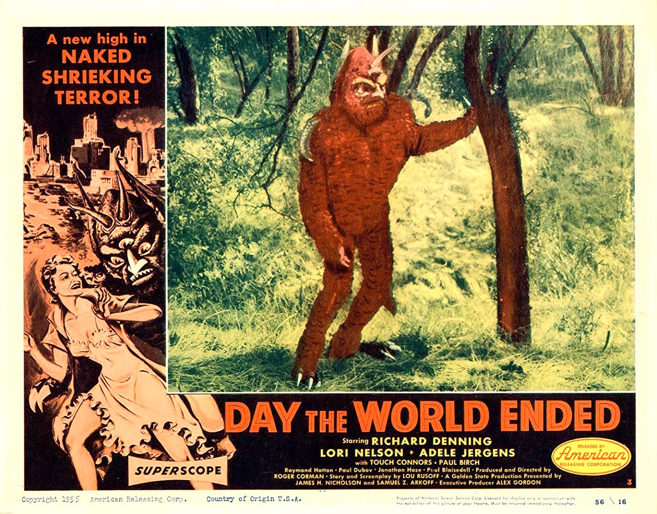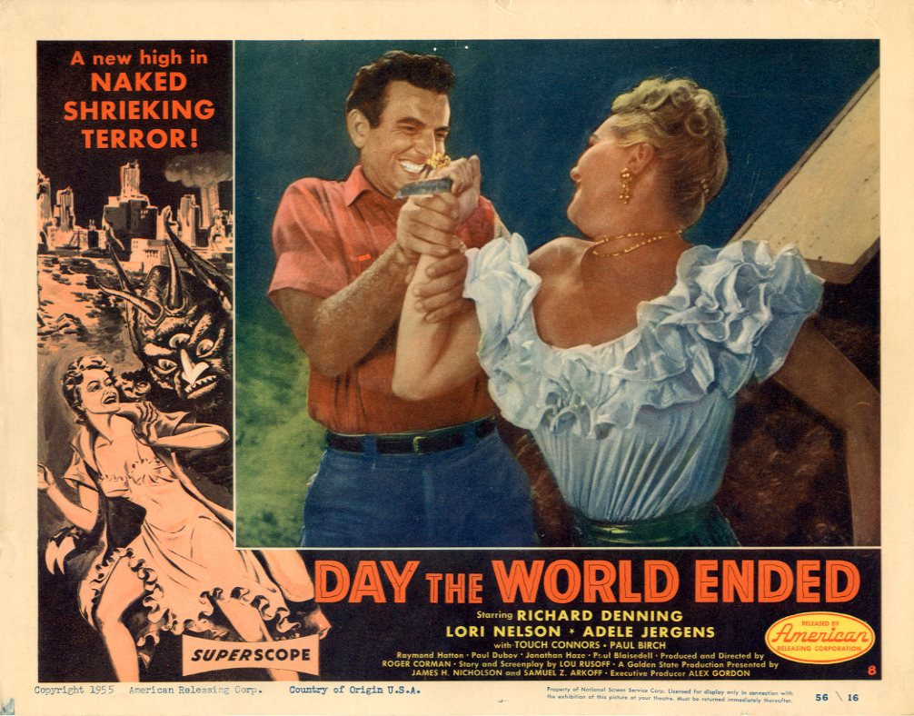 Day the World Ended stars Richard Denning as Rick, Lori Nelson as Jim’s daughter, Louise Maddison, Adele Jergens as Ruby, Mike Connors as gangster Tony Lamont, Paul Birch as survivalist Jim Maddison, Raymond Hatton as Pete, Paul Dubov as Radek, Jonathon Haze as Contaminated Man, and wonderful monster creator Paul Blaisdell as the mutant!