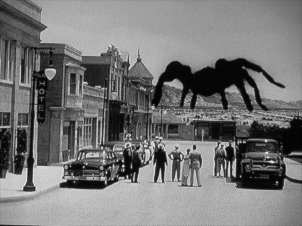 Now, Deemer gets a new assistant to help him in the lab. It’s “Steve” Clayton — the sexy staple of the 50s science fiction fair, Mara Corday! While there is an attraction developing between Steve and Matt, the tarantula is out there growing more gigantic by the minute, feeding on animals and people in its path, and Professor Deemer is showing signs of acromegaly. Once Matt figures out that they’re dealing with a giant tarantula after analyzing the pools of tarantula venom, he is aided by the local sheriff (Nestor Paiva) who calls in the Air Force to finally drop napalm on the beast, not before it crushes all kinds of American cars in it’s might jaws and stomps on Deemer’s house during his Shakespearean death scene.