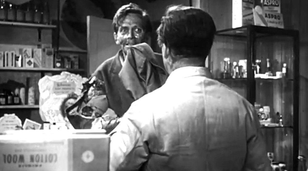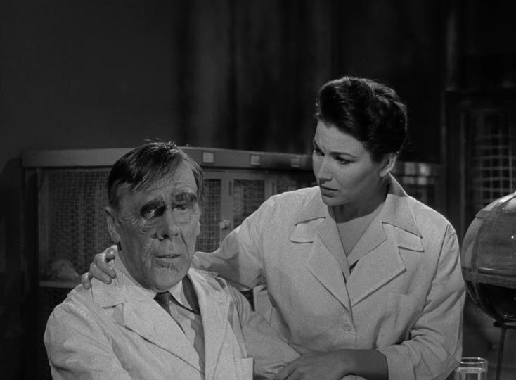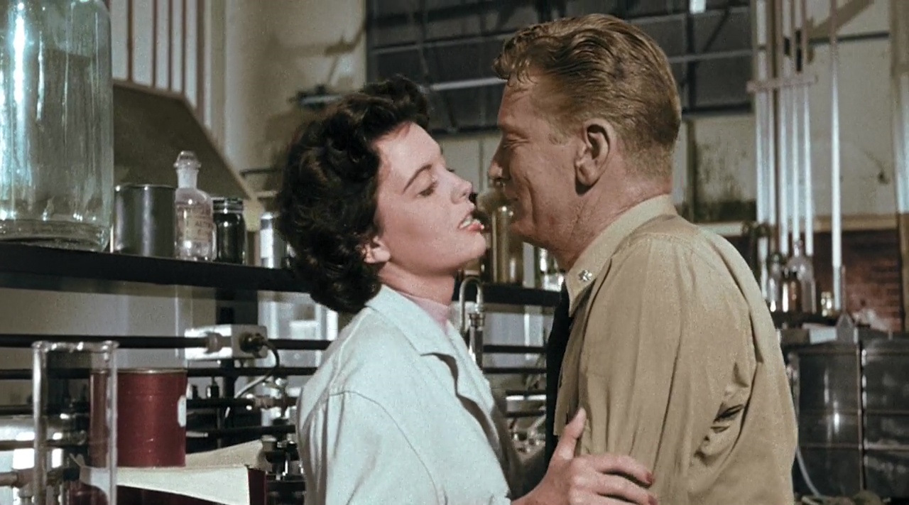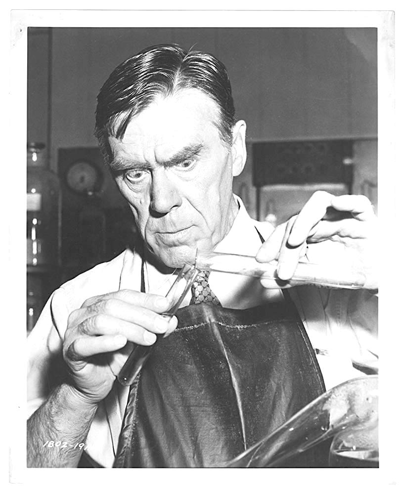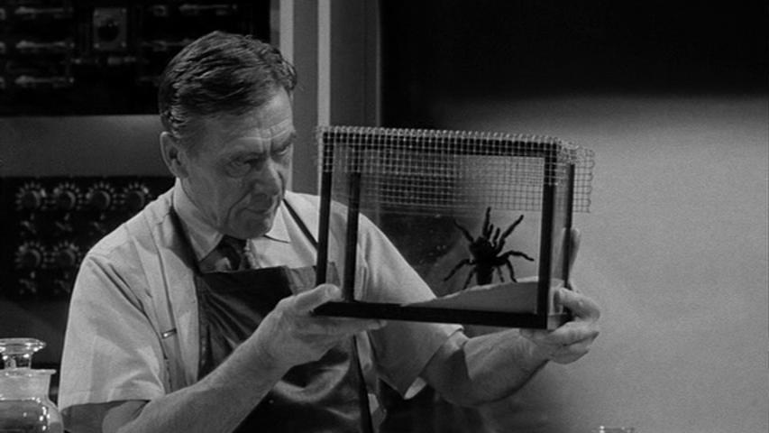 Deemer is working with an “atomically stabilized” artificial nutrient that he is trying to develop that would feed the world’s population. The problem, as is the case with these ‘fear of atomic energy’ science fiction cautionary tales, is that there are catastrophic side effects. The nutrient produces a side effect of gigantism in animals and acromegaly in human subjects. His lab is filled with cages harboring giant rats, guinea pigs, and a tarantula. In one scene, Lund, now out of his mind, crashes into the lab and injects Prof. Deemer with the nutrient. And during the scuffle, the tarantula, which has been injected with the same nutrient, escapes and creeps and ambles into the desert to wreak havoc with the small neighboring desert town.