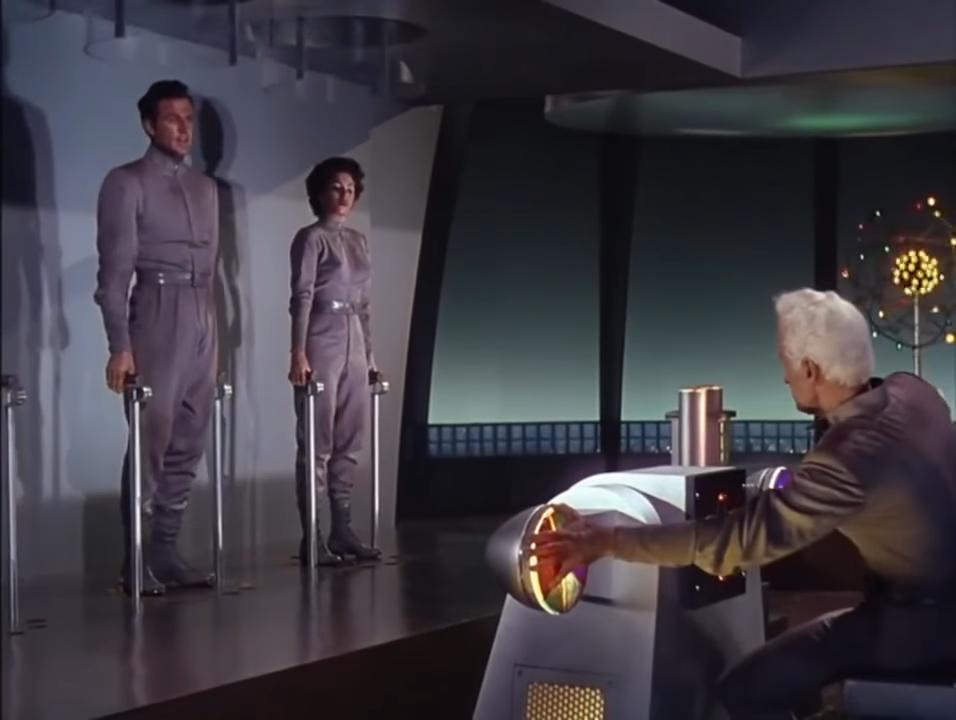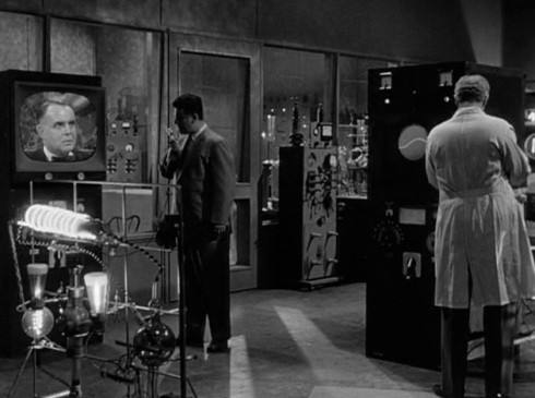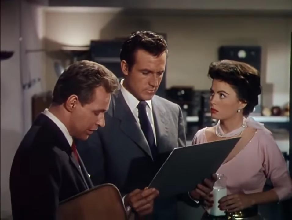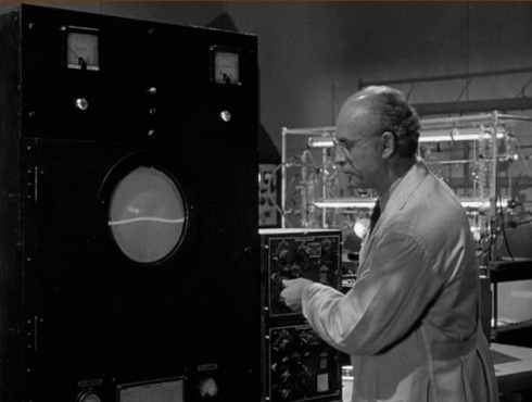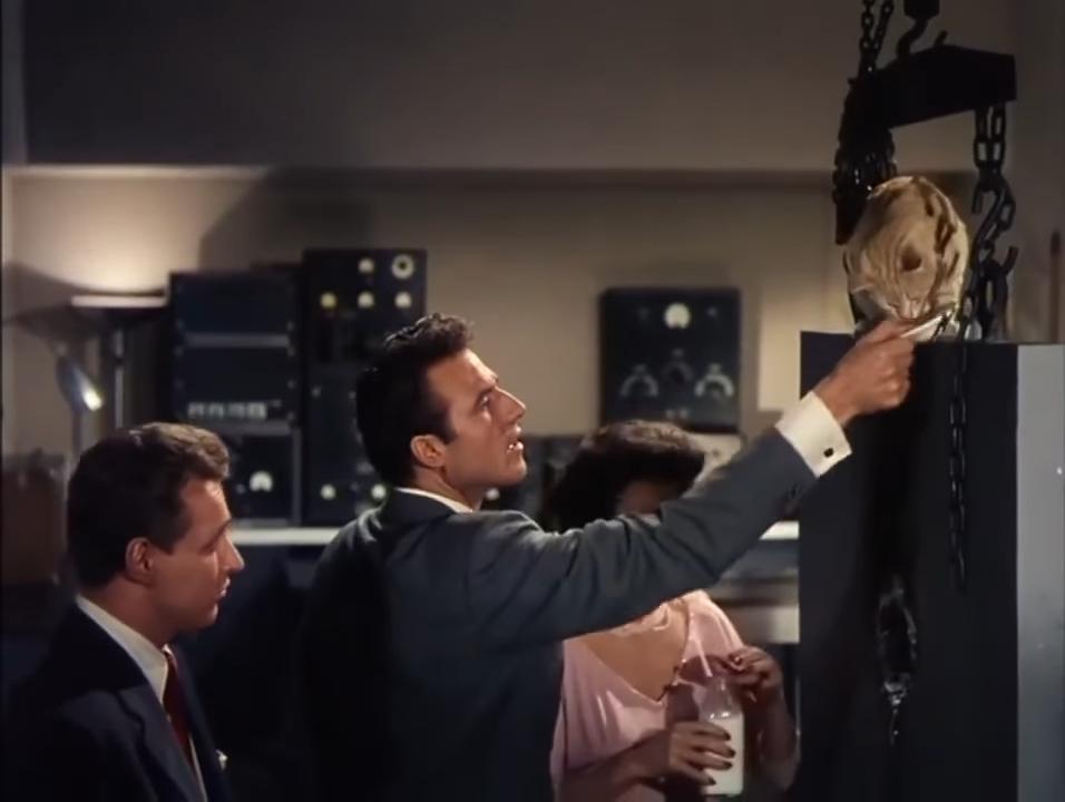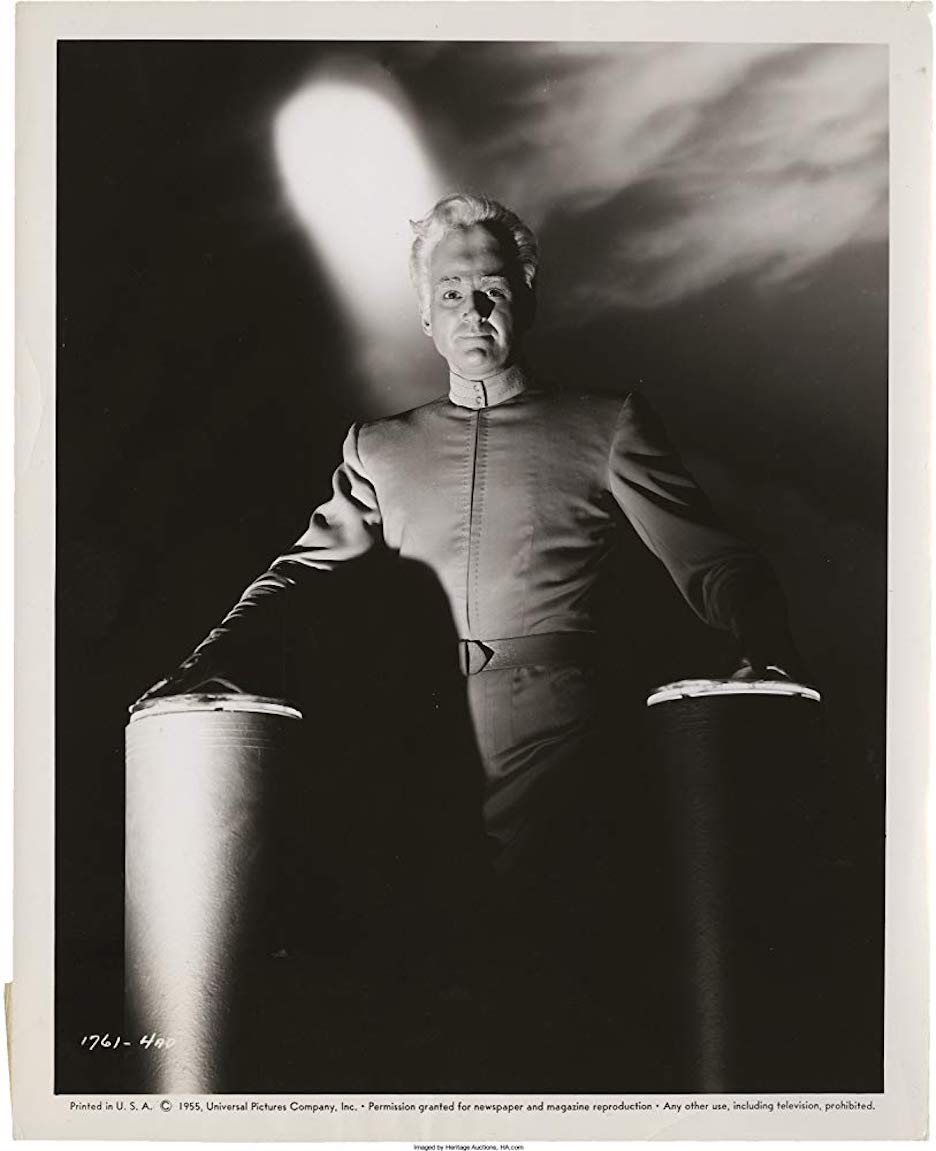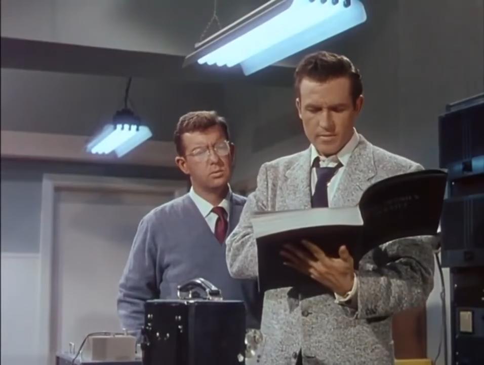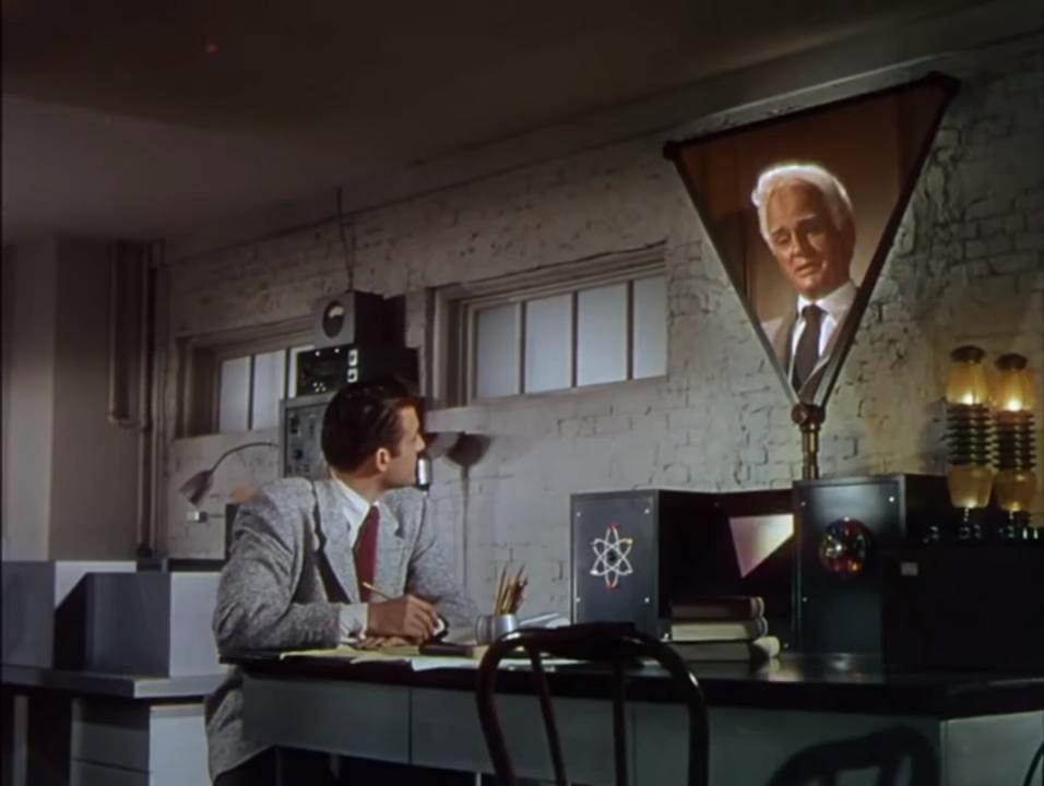 The story starts out with a nuclear scientist, Cal Meacham (Rex Reason), who is sent a mysterious electronics catalogue of schematics, which is an instruction on how to build an ‘interociter’. Before that, Meacham is saved in his jet by an inexplicable green glowing light. Once constructed, the piece of equipment turns out to be a three-dimensional triangular television screen on which the image of Exeter (Jeff Morrow) appears. Exeter is an alien with a really pronounced forehead and icy white hair and brows. Cal is informed by Exeter that he has passed the intelligence test and is convinced to join the other nuclear scientists from all over the world who were given the same challenge. The ‘interociter’ is an advanced invention that piques scientist Cal Meacham’s curiosity.