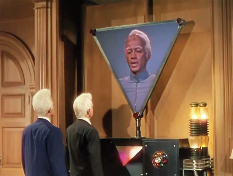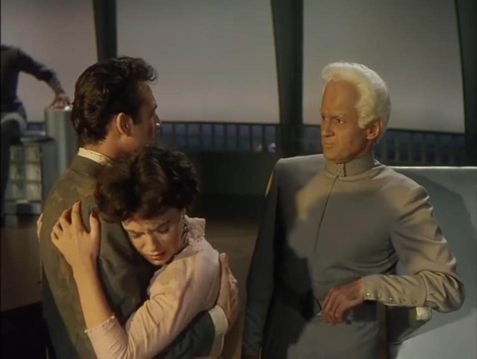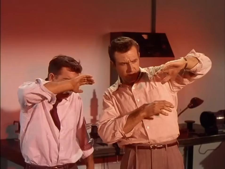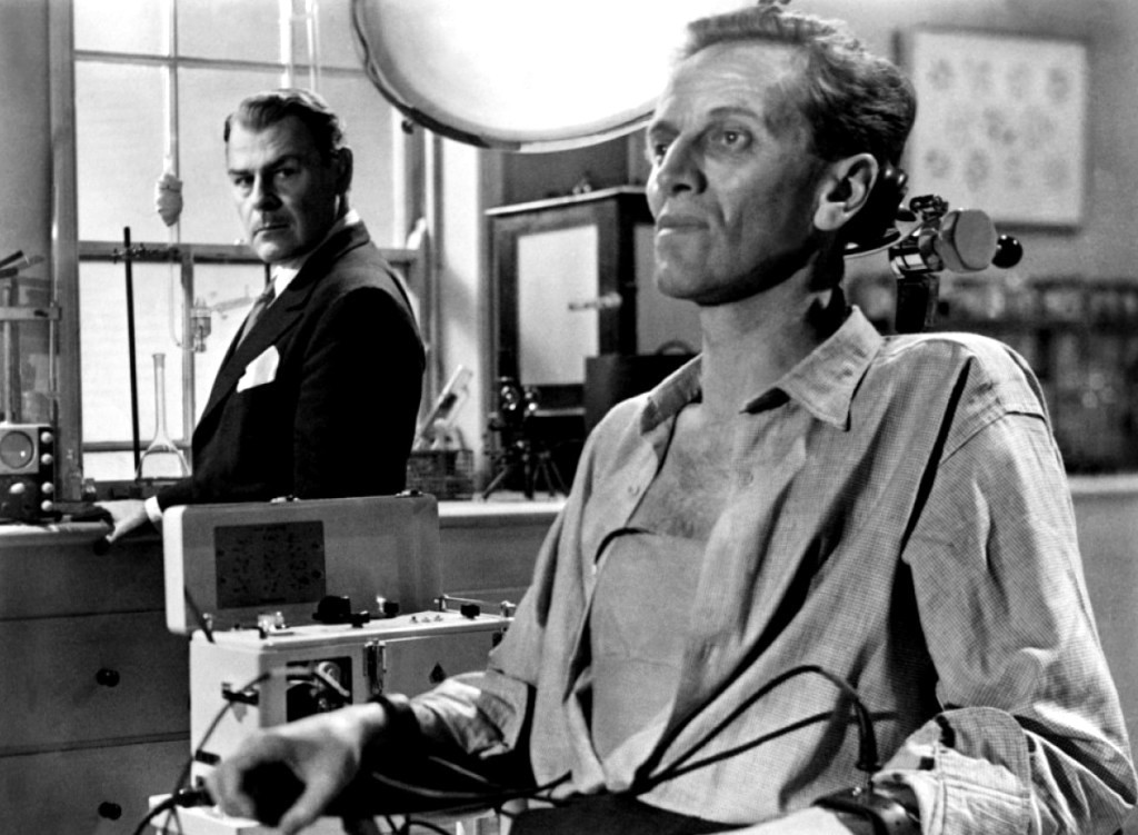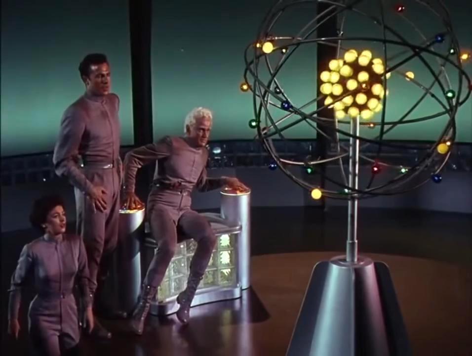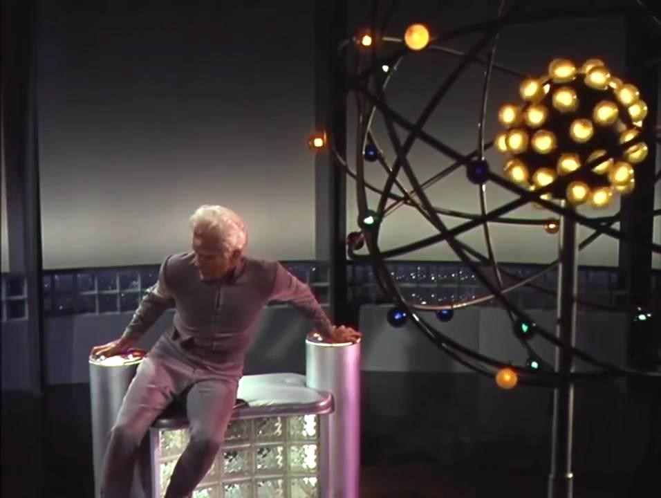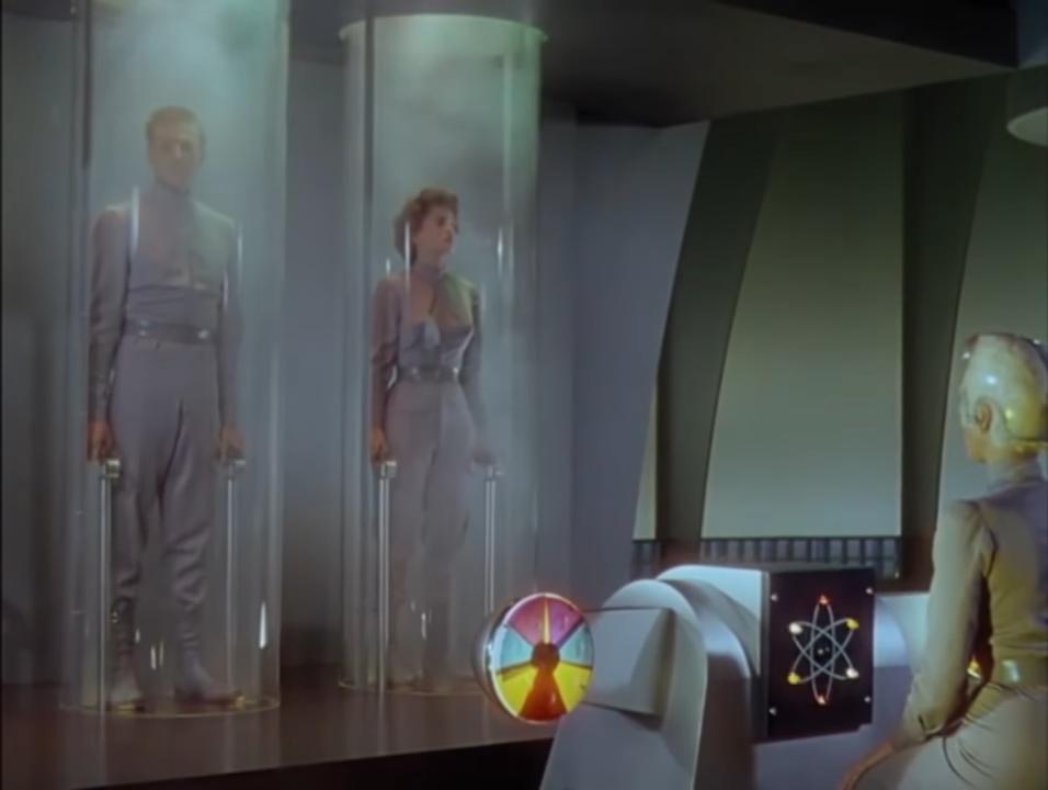 The story starts out with a nuclear scientist, Cal Meacham (Rex Reason), who is sent a mysterious electronics catalogue of schematics, which is an instruction on how to build an ‘interociter’. Before that, Meacham is saved in his jet by an inexplicable green glowing light. Once constructed, the piece of equipment turns out to be a three-dimensional triangular television screen on which the image of Exeter (Jeff Morrow) appears. Exeter is an alien with a really pronounced forehead and icy white hair and brows. Cal is informed by Exeter that he has passed the intelligence test and is convinced to join the other nuclear scientists from all over the world who were given the same challenge. The ‘interociter’ is an advanced invention that piques scientist Cal Meacham’s curiosity.