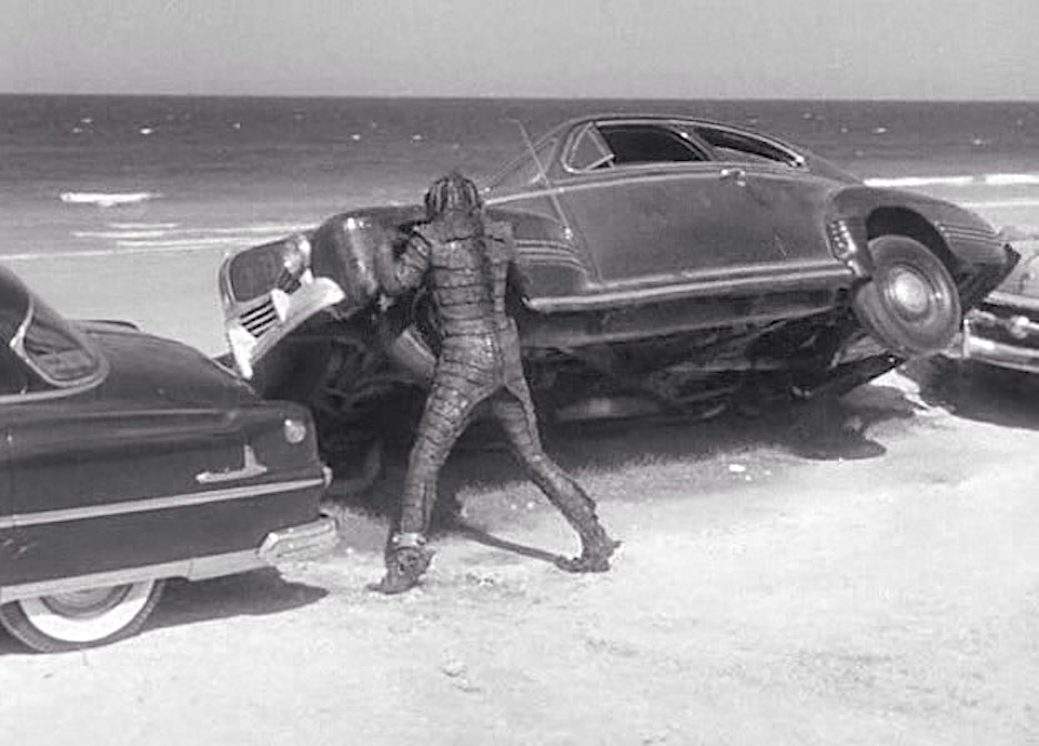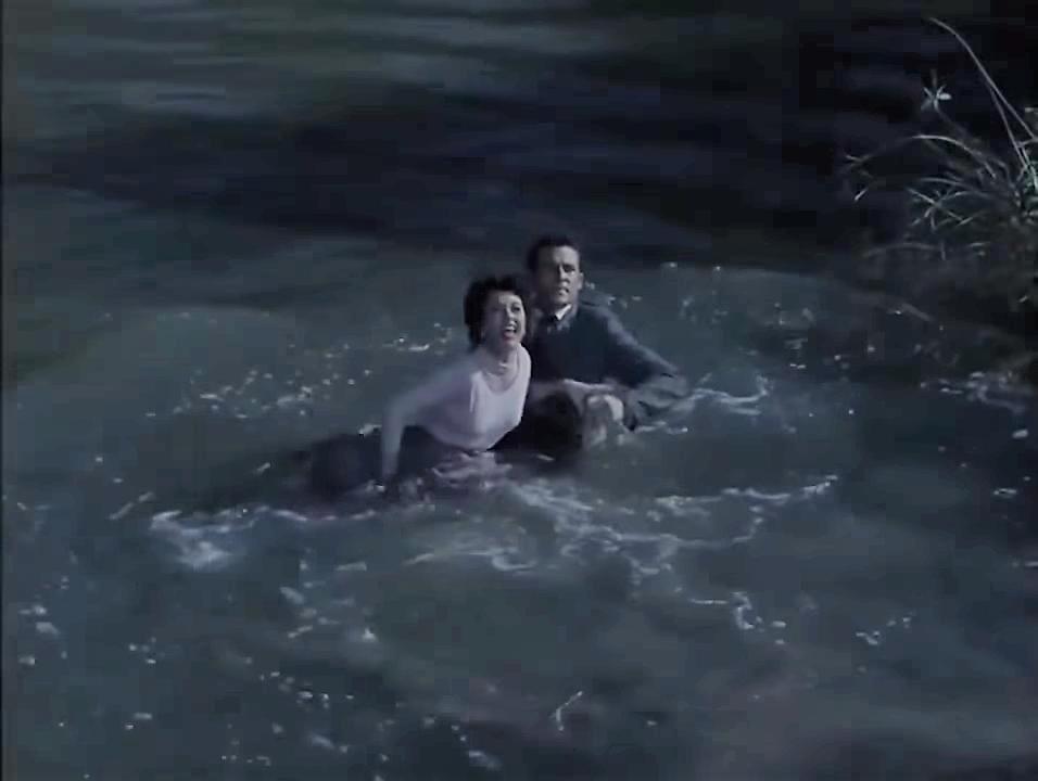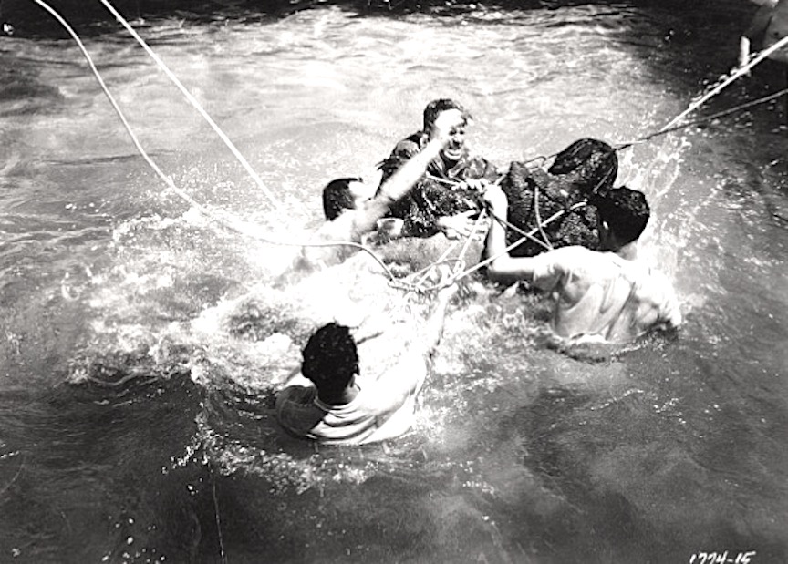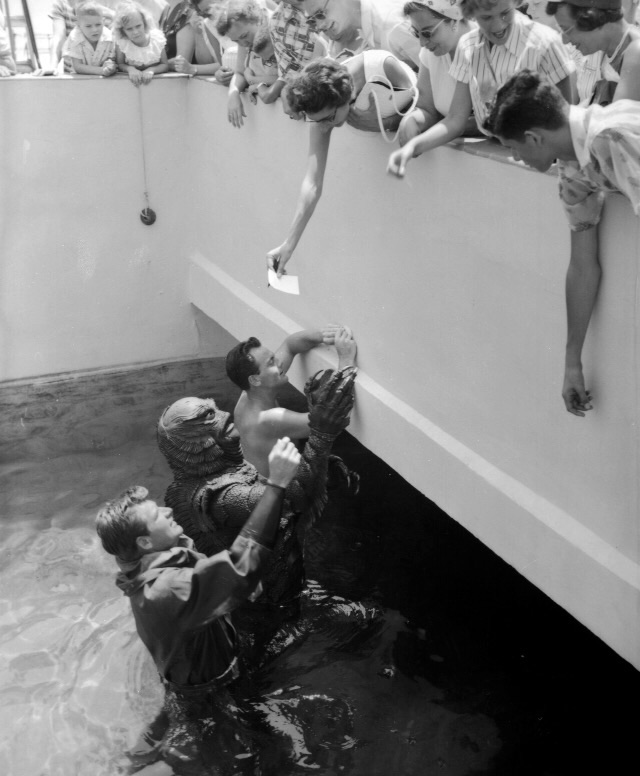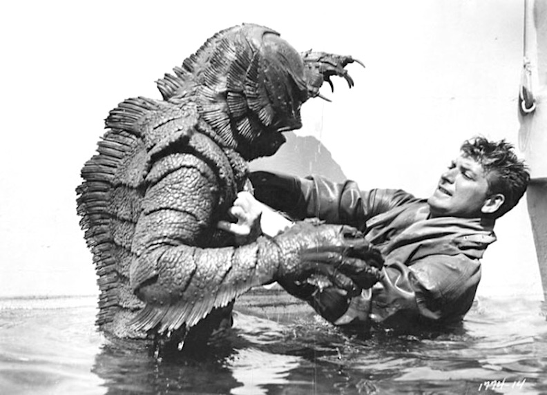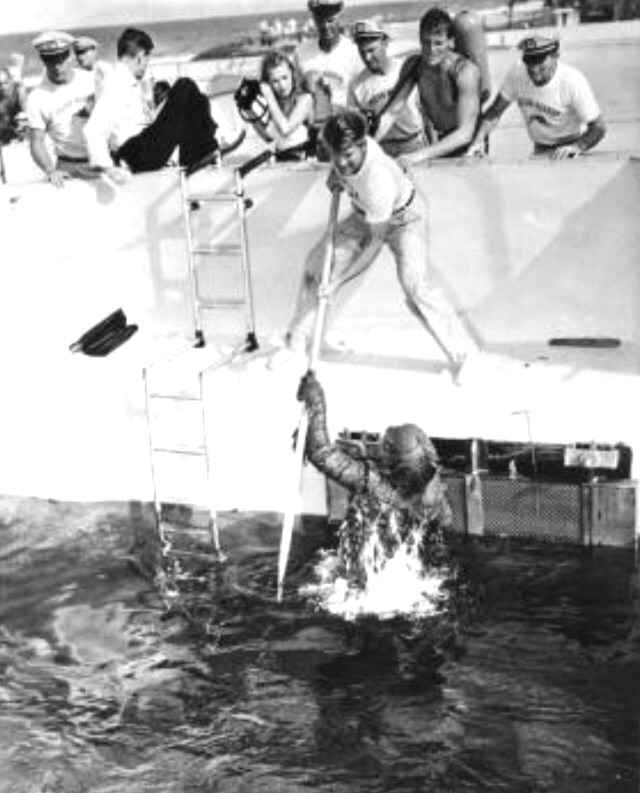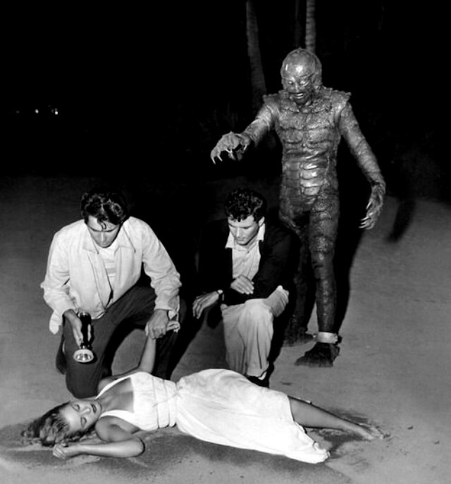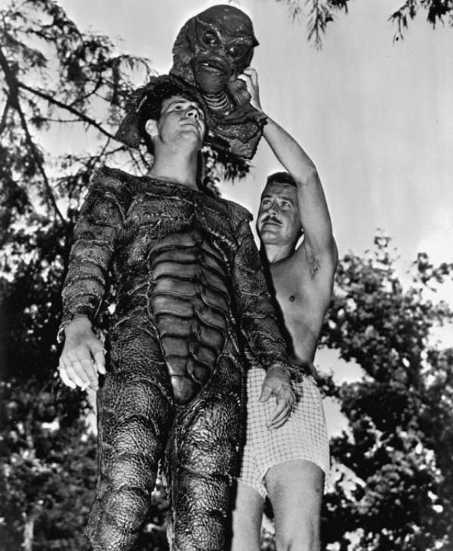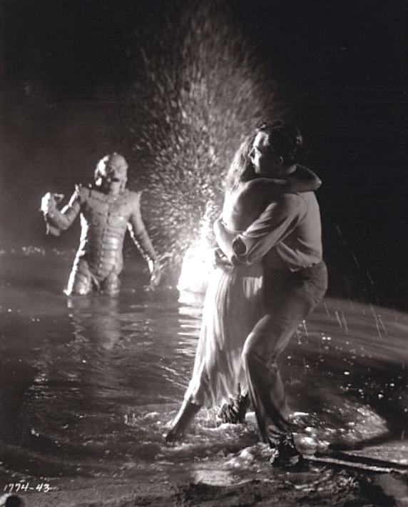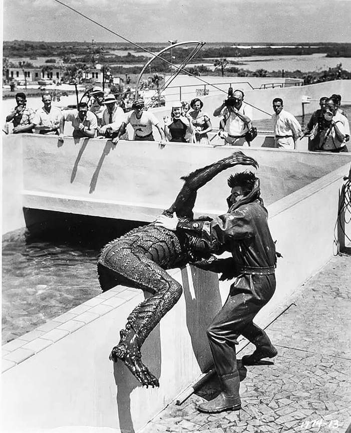 Actor/Stuntman Tom Hennesy almost drowned during filming. Playing The Creature, he grabs Helen Dobson (actually stuntwoman Ginger Stanley) on a pier and jumps with her into the water. The scene was shot at night, and when Hennesy and Stanley hit the water, they discovered it was full of jellyfish; in addition, a freak current started to pull them both down. Hennesy let go of Stanley, who swam to the surface, but Hennesy’s inflexible Gill-Man costume had become waterlogged and too heavy to fight the current. He was rescued by two local boys who happened to be watching the filming from a nearby boat, and quickly raced over and pulled him in.