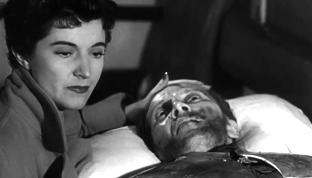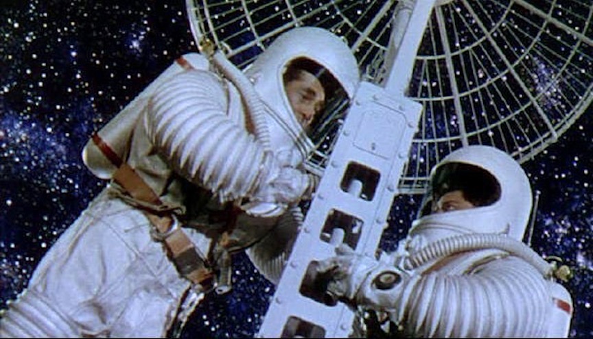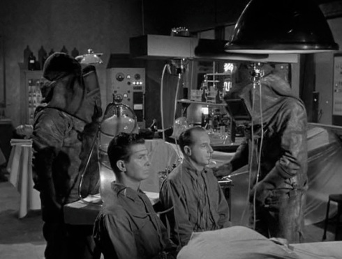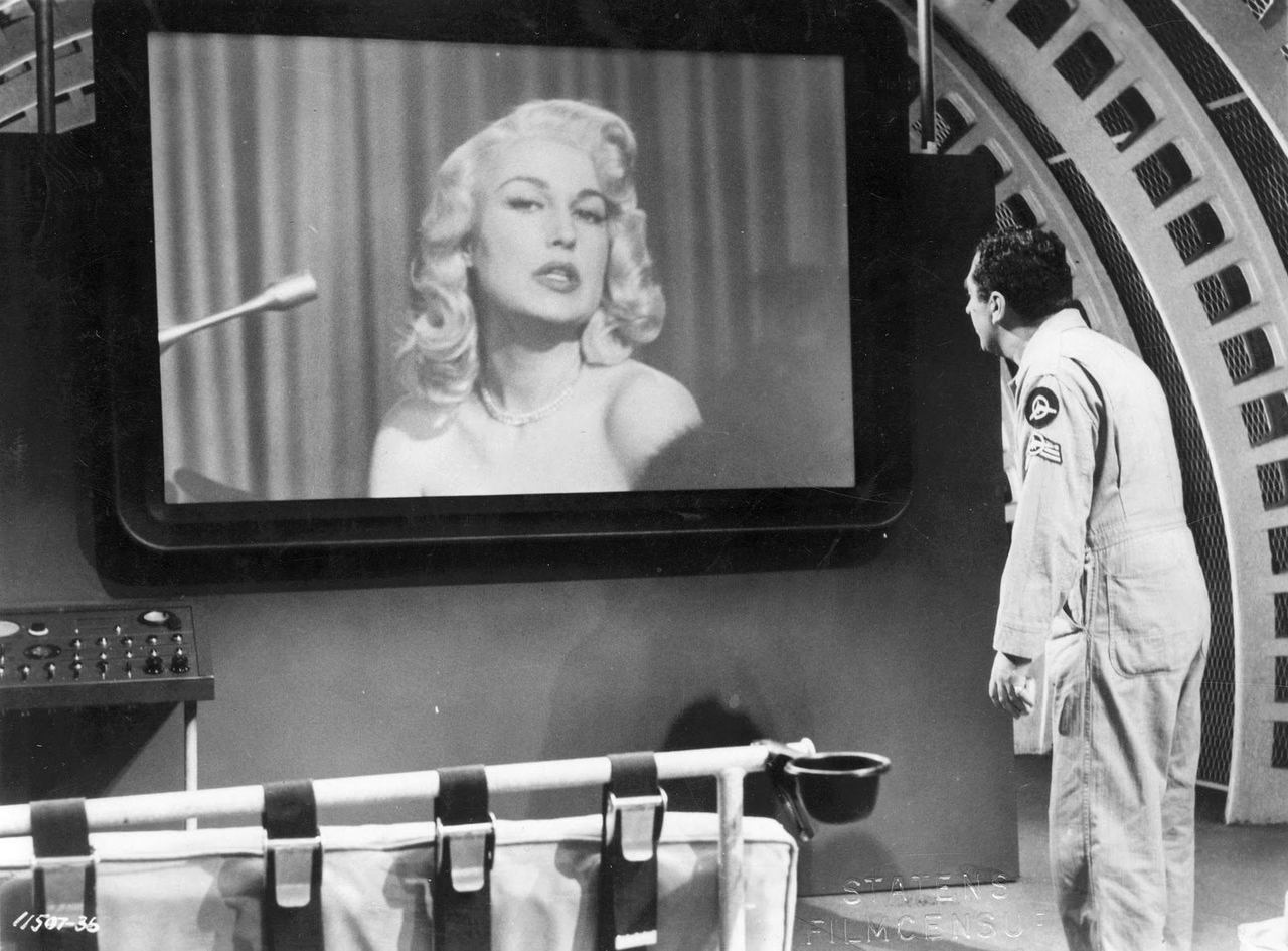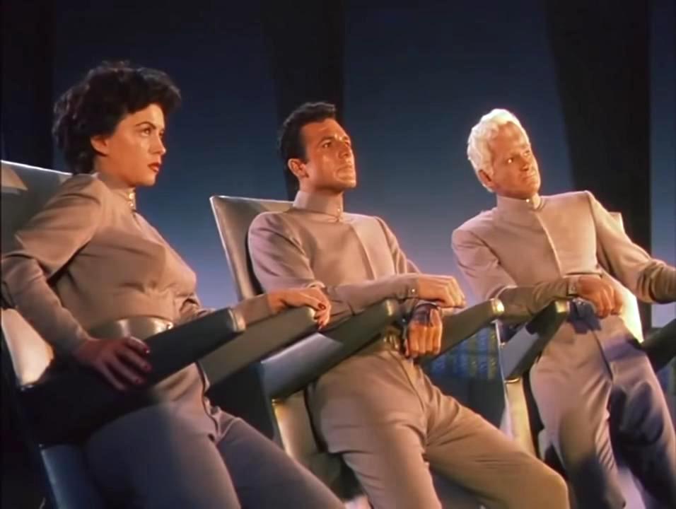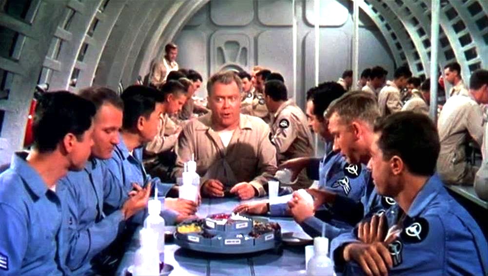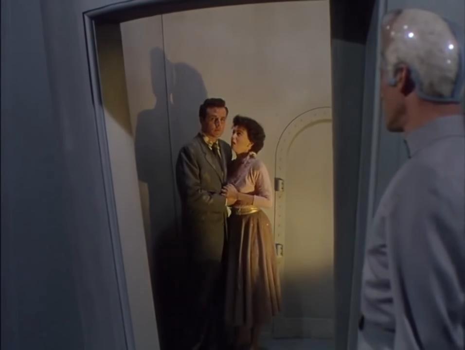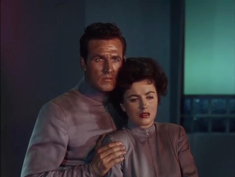 In the near future, a massive donut-shaped space station orbits the Earth, and a spaceship is being constructed for exploration. The ship is ordered to conduct a mission to Mars, but the Captain (Walter Brooke), who begins to have a philosophical & religious crisis as to the journey of humans reaching into space as an attempt to reach the domain of God. The aspects of religious introspection were examined in another science fiction film, that of H.G. Wells’ War of the Worlds, George Pal’s superior work. General Merritt suddenly thinks it is sacrilegious to explore the heavens and tries to stop the ship from landing. “There are some things that man is not meant to do.” Eric Fleming plays Merritt’s son, Captain Barney Merritt, who is the film’s symbolic yet bland hero.