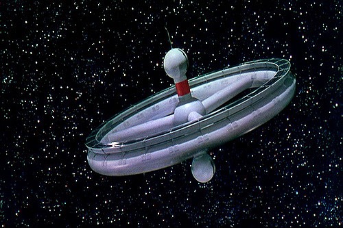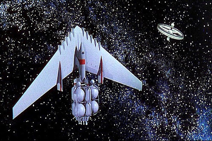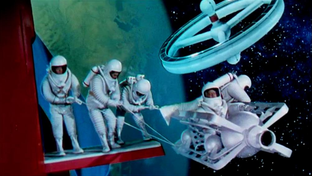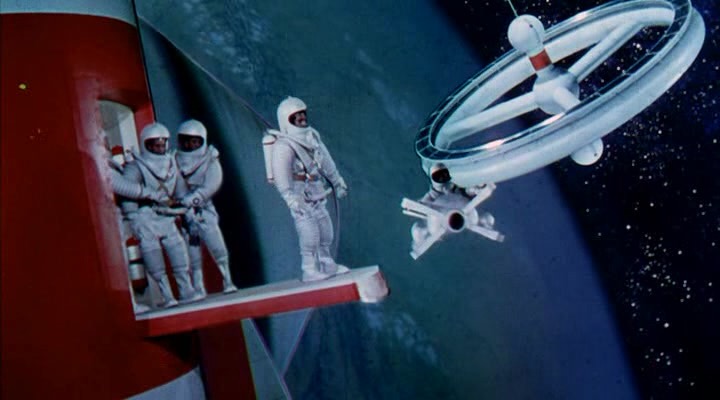 Narrator: This is a story of tomorrow, or the day after tomorrow, when men have built a station in space, constructed in the form of a great wheel, and set a thousand miles out from the Earth, fixed by gravity, and turning about the world every two hours, serving a double purpose: an observation post in the heavens, and a place where a spaceship can be assembled, and then launched to explore other planets, and the vast universe itself, in the last and greatest adventure of mankind, the plunge toward the…