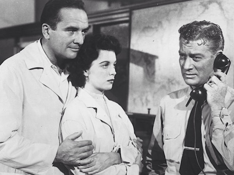 Stars Richard Denning as Dr. Chet Walker, Angela Stevens as Joyce Walker, S. John Launer as Capt. Dave Harris, Michael Granger as Frank Buchanan, Gregory Gaye as Dr. Wilhelm Steigg, Linda Bennett as Penny Walker, Tristram Coffin as District Attorney MacGraw, Harry Lauter as Reporter #1, and Charles Evans as Chief Camden.
