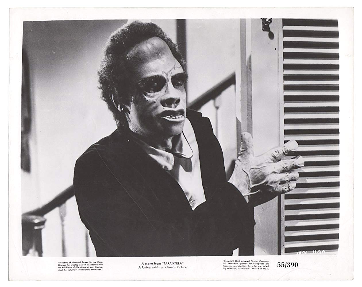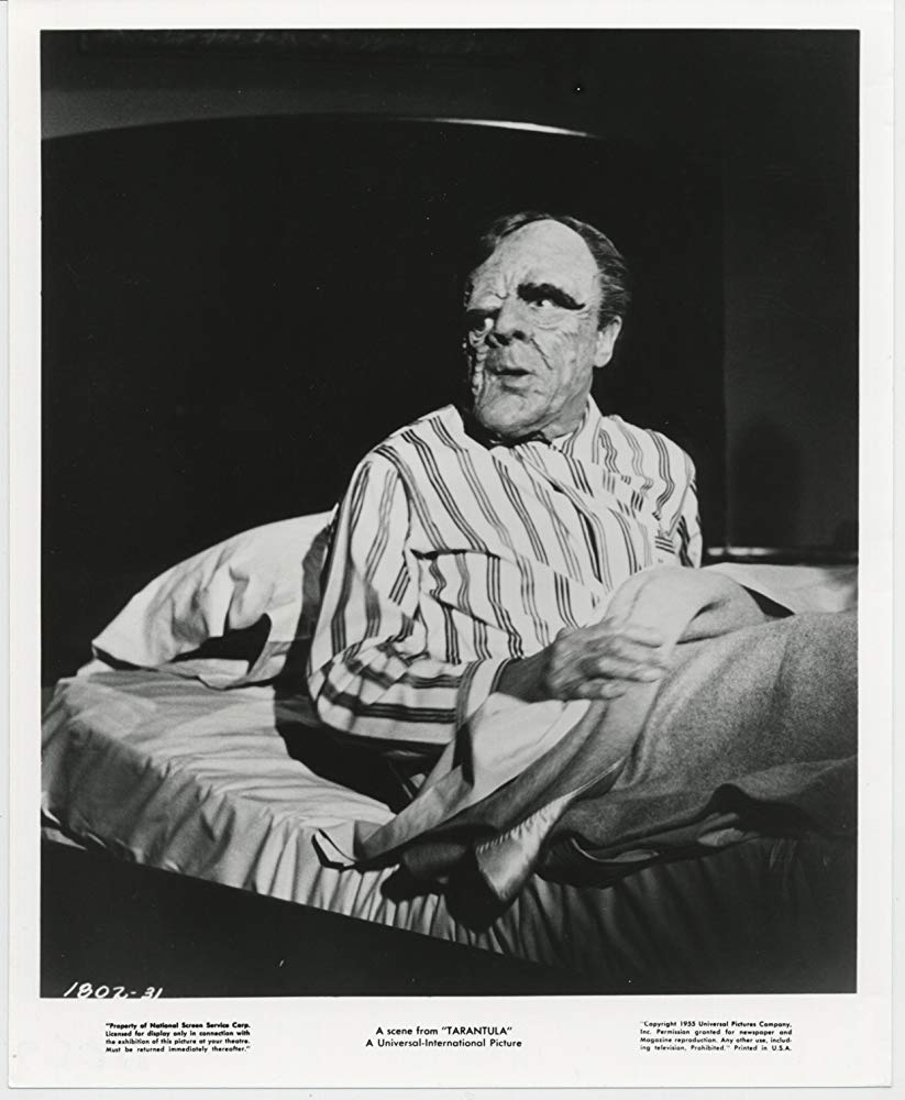After the success of Warner Bros’ Them! Universal-International saw the need to compete with their own giant bug movie, and Tarantula is quite a distinguishing film in the sub-genre of science fiction/horror hybrids. The story concerns the central character Professor Gerald Deemer (Leo G. Carroll), who is trying to find an answer to world hunger and a sufficient food supply. The film opens when the deformed assistant to Professor Deemer (Eddie Parker) collapses in the desert and succumbs to exposure and whatever mysterious ailment he is suffering from. Dr. Matt Hastings (our unyielding sci-fi hero, John Agar) examines the body and discovers that he had acromegaly, an illness that is normally slow in its progression. This throws off the identification of the body as it resembles Deemer’s associate; it logically cannot be the same man. But in fact, it is Deemer’s partner who has been working with the scientist on a secret experiment in his desert lab. Deemer’s other associate Paul Lund (also played by Eddie Parker) is likewise suffering from acromegaly.
