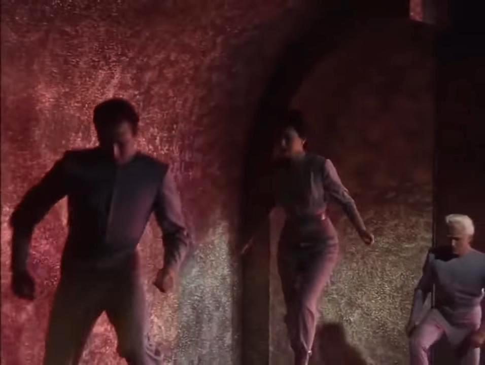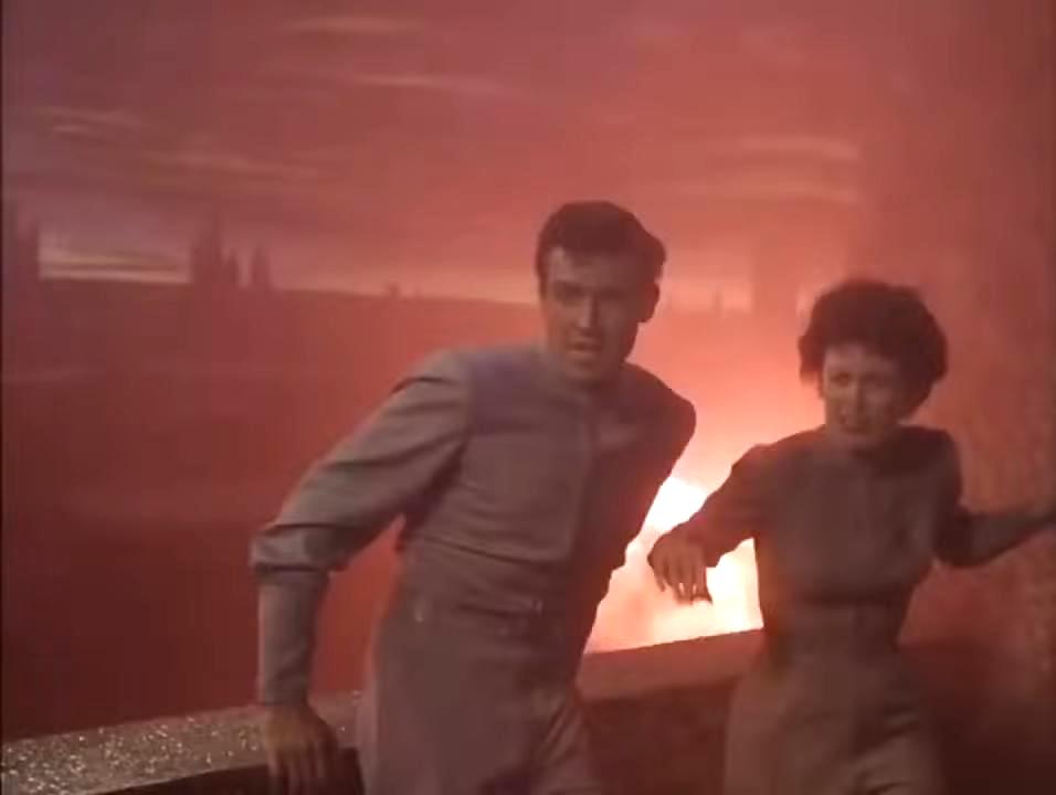 But a meteor strike takes out the Mutant pants monster, and Exeter has a change of heart, letting the scientists return to Earth. When they get back in the flying saucer, they are assailed by another Mutant wearing (Hanes Casual) pants in gray polyester. Though the Mutant is injured, it is strong enough to hurt Exeter before they can board, and manages to drag himself onto the ship unbeknownst to the three. After they take off, the atmospheric pressure winds up killing the Mutant but not before it terrorizes Ruth, in a Mutant–Woman in Peril ballet. In the background, we see what is left of Metaluna as it lights up in a fiery glowing explosion. Exeter, in his altruistic wisdom, spouts a daydreamer’s soliloquy about the stars, hoping that Metaluna’s incandescent glow will light the way for another planet to thrive.