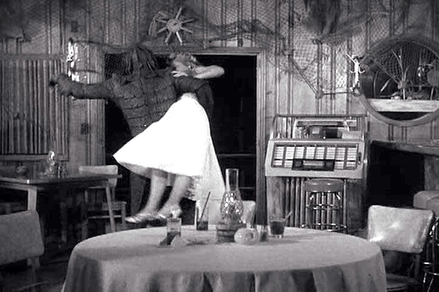 But knowing the word no doesn’t stop him from wanting his freedom, so he kills Joe and escapes his tank and finds his way back to the ocean, then starts to stalk Helen, watching her and Clete when they go out on their romantic excursion up the river, eventually grabbing her right out of the middle of a dance at a seafood restaurant, The Lobster House. Clete, in pursuit, manages to stop him by shouting that wonderful word, ‘no,’ long enough for him to be shouted down once again.