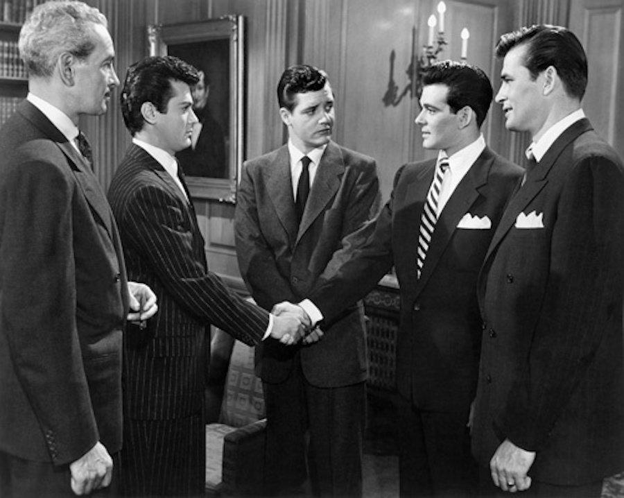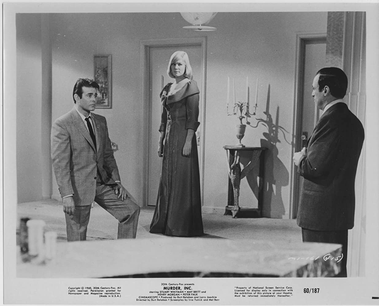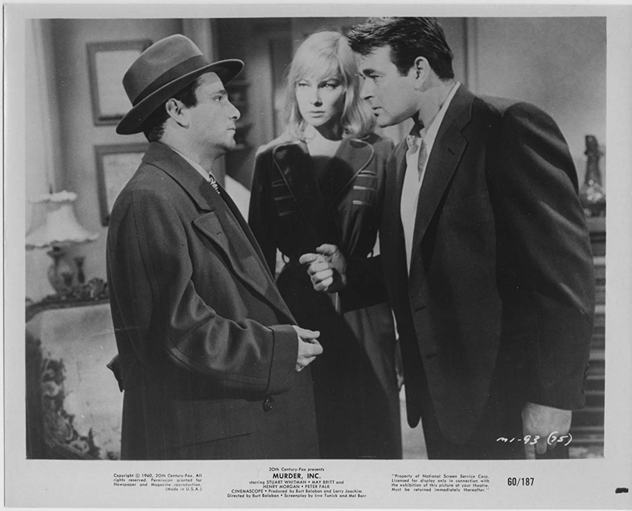 STUART WHITMAN: “I did that while I was still under contract to 20th They said “you’re going off to New York to do this thing called Murder, Inc. So on the plane I’m reading the script, and I’m thinking “wow! What a role here” Abe Reles” And when I got to New York and they picked me up in a limo at the airport, they asked me “how did you like the script? “Oh God, I just loved it” And they said “we got an interesting young guy, a character actor named Peter Falk who’s gonna plays Abe Reles” “Wait” I said, “I thought that was my role” “No, no You’re going to play the kid in it.. with May Britt.. the love affair part of the story.” And I said “Oh shit, I don’t want to do it. SO I called up (Spyros) Skouras (president of 20th Century Fox from 42 to 62) and said “Now Mrs Skouras that’s not the role I wanted to do” No do it” he said.
