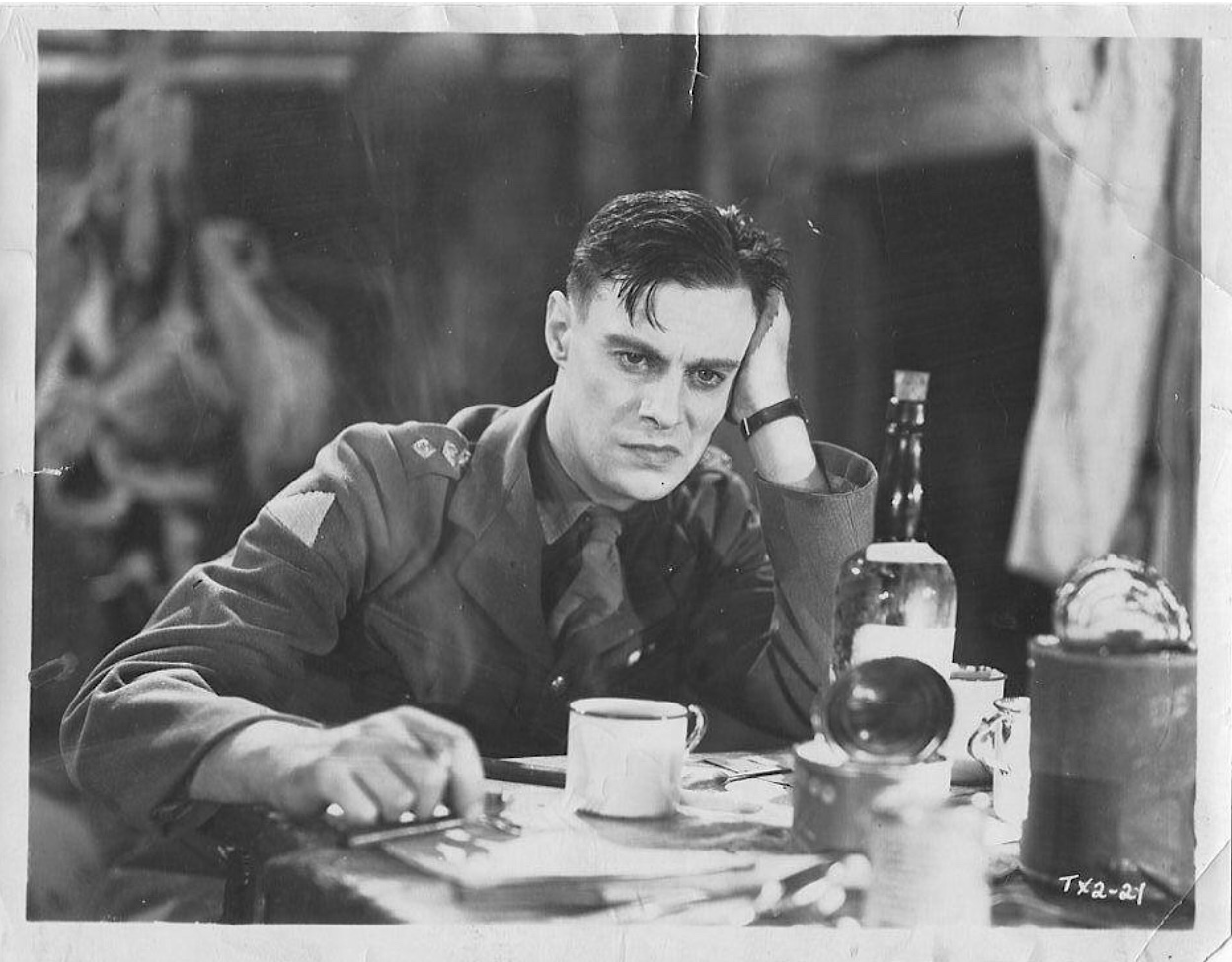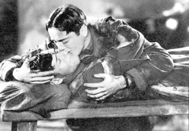 Journey’s End (1930), directed by James Whale. The film takes place in France in 1917. The film is not explicitly gay; you can still read a gay subtext. Also, consider that often, with Whale’s gay sensibility in his films, he enhanced the plot and played with convention, so the typical story of a heterosexual war drama about male bonding in the trenches is vaguely flipped on its head. Journey’s End shows an intimacy between some of its male characters. Gay actor Colin Clive plays Stanhope, an alcoholic who has spent several traumatic years at the Front. He worships his older service member Osborne (Ian Maclaren), whose nickname is ‘Uncle.’ Stanhope has grown to depend on Osborn for support and companionship. This, of course, is a common thread in films that deal with intimate friendships between groups of men in war or in prison. Their relationship develops throughout the film, and the coded homosexual implications exist on screen that their friendship is more than just camaraderie. Stanhope and Osborn share a deeply personal bond within the closed universe of the wartime trenches, where emotions become known.
