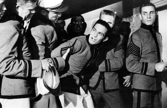 the film wallows in a steamy mixture of homoerotic imagery and verbal innuendo. The mise-en-scene is filled with phallic signifiers, such as towers, trumpets, cigars, flashlights, nightsticks, bottles brooms swords and scores of erect young men marching sweatingly through the night… The specter of homosexuality also envelops the characters of Cadet Perrin, and effete poet who idolworhips Jocko and Cadet Simmons, a Peter Lorre look-alike who refuses to date girls or shower with the other cadets. Ultimately all this queerness is dislplace onto Jocko’s violent sadism, a linkage not uncommon in the ear’s medical discourse about homosexuality… Jocko calls Cadet Perrin a ‘three-dollar bill” and repeatedly towel whips his ass its hard not to read the scene as a metaphoric sodomy wherein (Code-sanctioned) homosocial violence displaces (Code -forbidden ) homosexual contact. The story itself is an extended gloss on secrecy in the barracks centering on a bizzare narrative event that also speaks of homosexuality in barely coded ways.(Jeffrey Sconce)