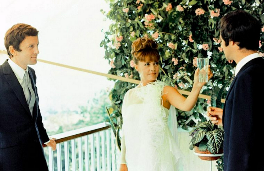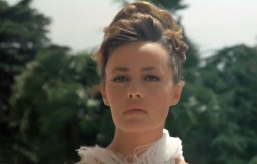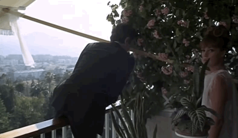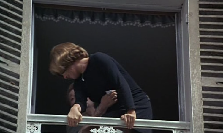 Striking a dying-to-know-you pose, Bliss (Claude Rich) and his best friend Corey (Jean-Claude Brialy) take notice of this vision in white. Bliss-“She’s an apparition. Corey-“An apparition who won’t say who she is”. Intrigued, Bliss allows himself to be coaxed out onto the balcony. As he climbs onto the railing to retrieve her wispy white scarf, she tells him who she is, we first learn her name. “I’m Julie Kohler”, as she pushes him off, he falls to his death.