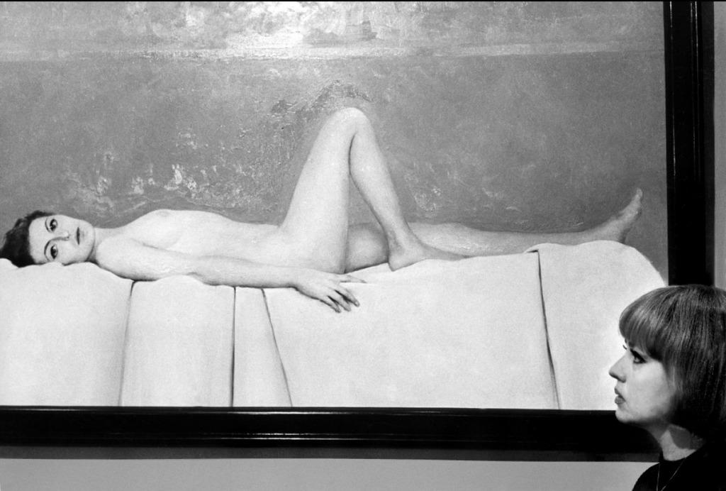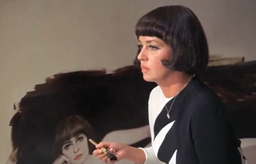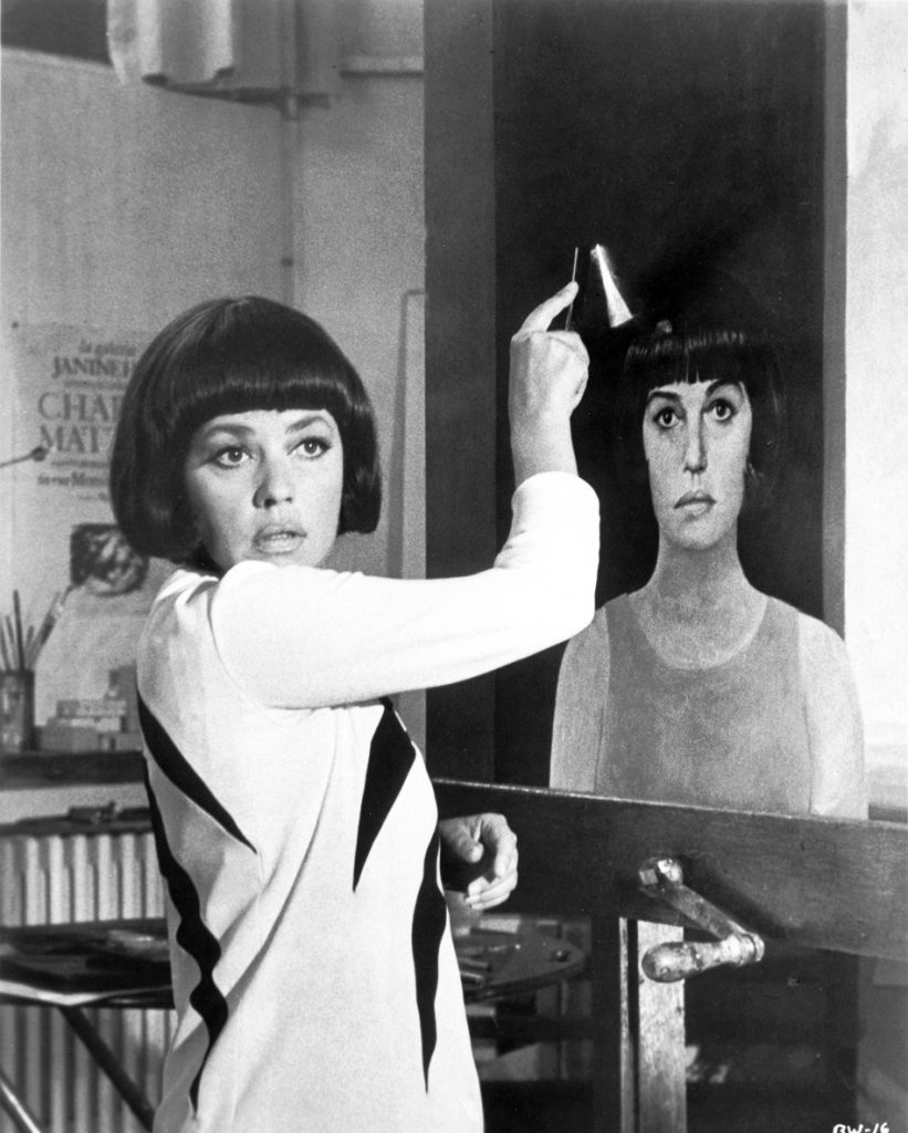 As Fergus’ muse, Julie wears a similar hairstyle, coiffed short black framing her face, she borrows the look to appeal to Fergus, who wants to use her for his series of illustrations. He asks her name, and she tells him, “Call me Diana, that’s all”. Fergus winds up falling in love with her. When she rebuffs his confession of love, he paints the captivating full-length nude mural of her on the wall by his bed. Julie in her stark naked repose totally dominates Fergus’ studio.