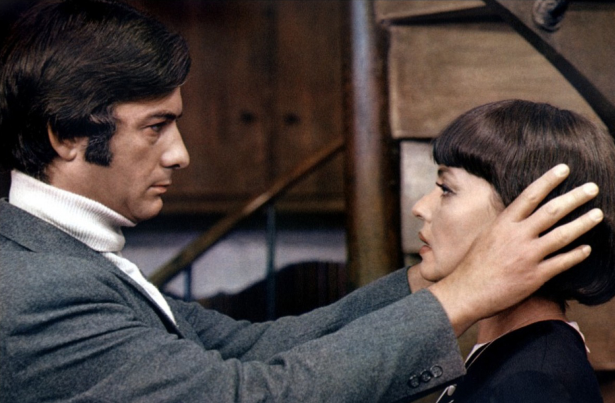 Following the death of her first victim Bliss, the mysterious Julie Kohler shows up at a seedy hotel where she designs to meet a man named Robert Coral (Michel Bouquet). At his dingy, untidy studio apartment, she gathers background information about him from his landlady who is more than willing to relate how shy he is around women. Julie bates the woman – “What he’s looking for is an ideal woman, a woman he can’t find and who exists only in his imagination.” “You’re right. I’ve noticed that whenever the poor man looks at a woman, he gets white as a sheet or red as a lobster.” Armed with this insight, Julie sends him an anonymous theater ticket and he readily shows up that evening. Waiting in the theater box, anticipating his secret date, Julie appears in a black evening gown draped in a white cape, yet another representation of the unearthly aura that surrounds her. He asks her name, but she tells him no and that it’s her secret. Coral is a very lonely soul. The next time they meet, “I shall tell you how, where, when, and why.”