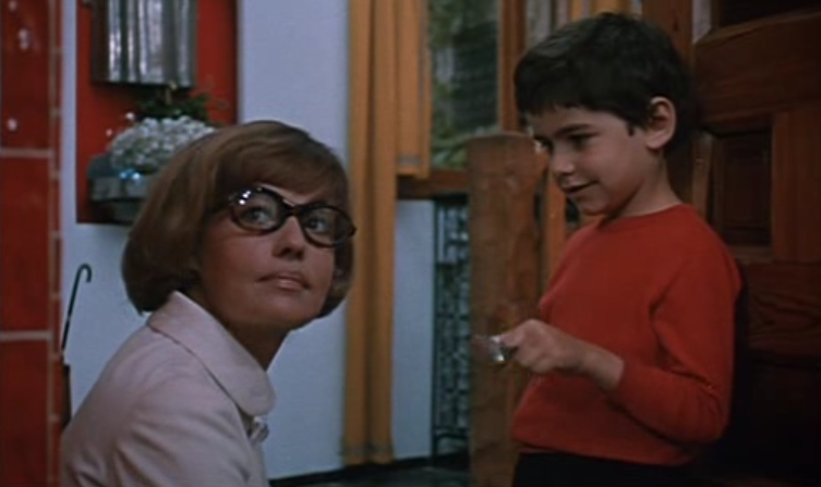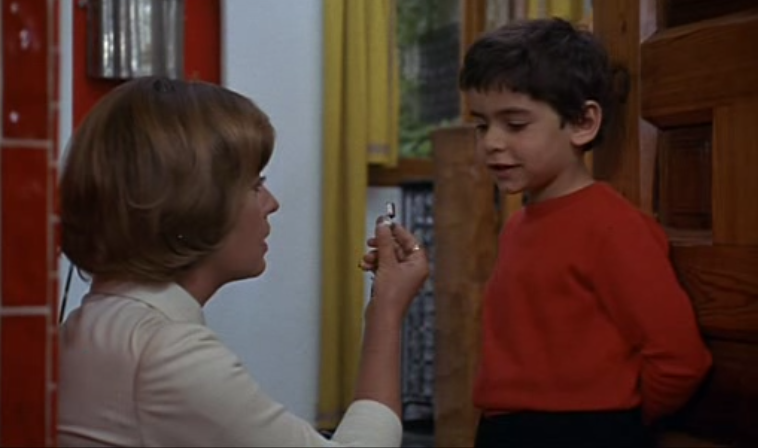 Julie fools his wife, Madame Morane (Sylvine Delannoy), into writing a letter that her mother is very ill, getting her out of their middle-class home. Later, Julie arrives posing as Cookie’s teacher Miss Becker, though Cookie insists to his father that she is not her. Julie is invited to stay for dinner, even playing a game of hide and seek, where she discovers a cramped closet set underneath the staircase.
