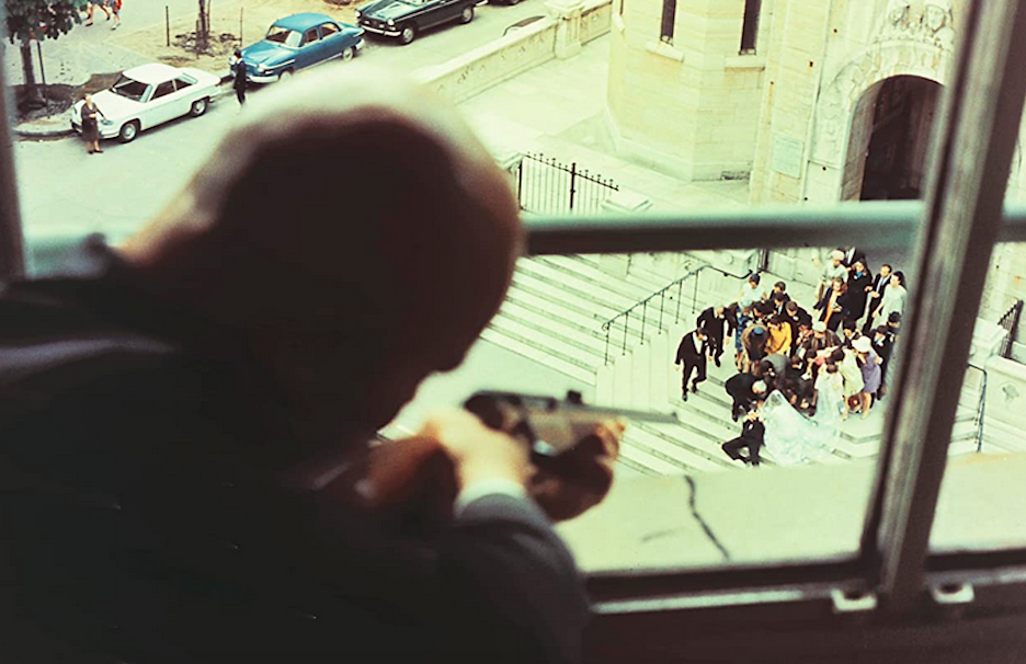 In flashback, it is revealed how it led up to the shooting. On her wedding day, the five men are playing cards in a building across the street from the church. Morane takes a rifle down off the wall and loads the gun, aiming it at a weather vane.