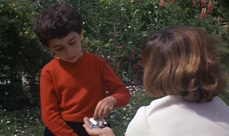 Clément Morane (Michael Lonsdale) a married politician with a young son, becomes the third victim. Julie appears this time in a white suit, faintly sinister, to Morane’s little boy Cookie outside his home. Without telling him her name, she plays a game in order to swipe his little tin whistle she could later give back to him when she returns to the house. She collects information about Cookie’s family, learning that his Grandmother lives somewhere else, a fact she can use later on.
