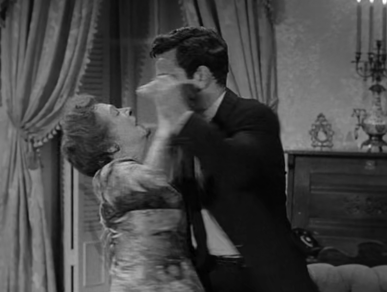 Alice is home with John now. “Oh, darling, I’m so glad you’re here. Everyone’s been so horrid. Why is it that nobody wants to be happy or enjoy life except me?” “Poor baby, nobody understands you, do they?… Except you. She kisses him. John obviously adores her.