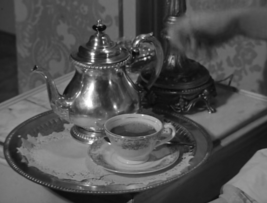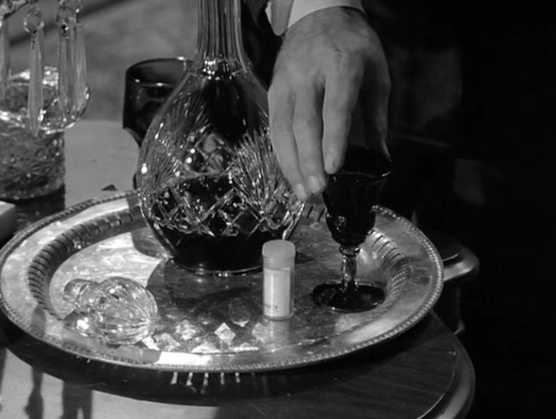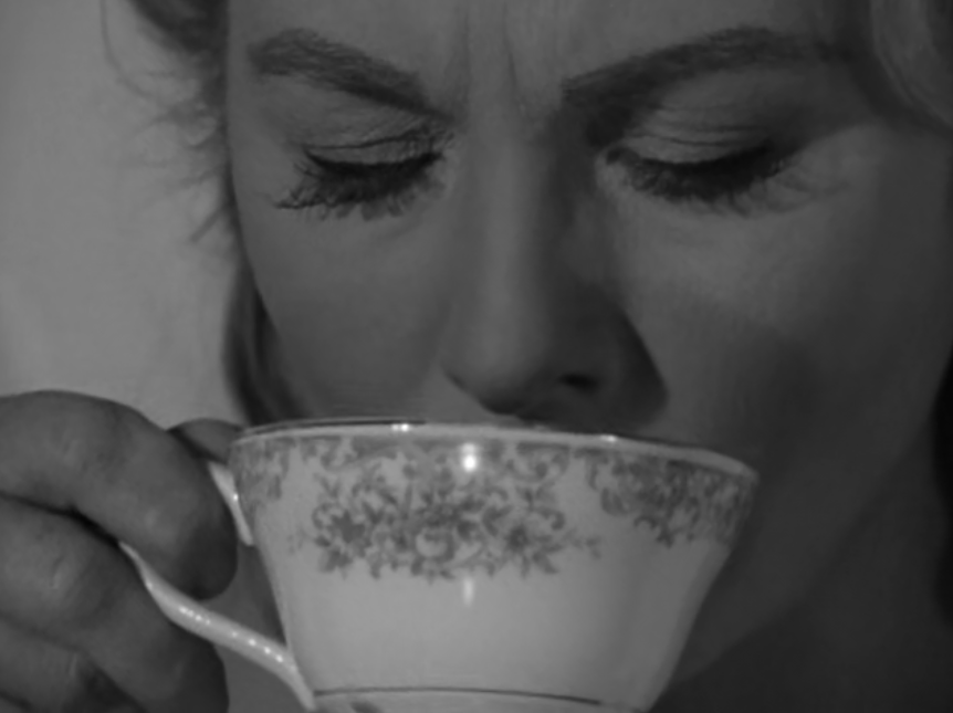 She drinks the lethal cup of cocoa, now doomed to relive the moody opening sequence with the waves of darkness closing in on her. The cup is framed in close-up, once again, it is a nod to Hitchcock’s Suspicion when Cary Grant brings the glass of milk up the stairs.