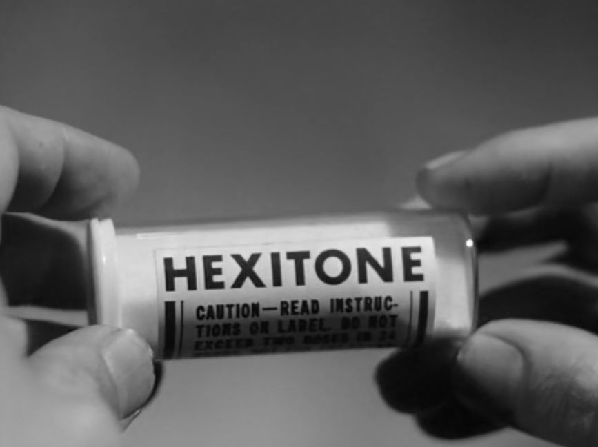 Hayes strategically features the medicine bottle in several close-ups throughout the hour-long episode, ensuring that viewers remain aware of its presence. The label reveals that the drug, Hexitone, is actually methohexitone – a powerful barbiturate used as an anesthetic in the late 1950s.