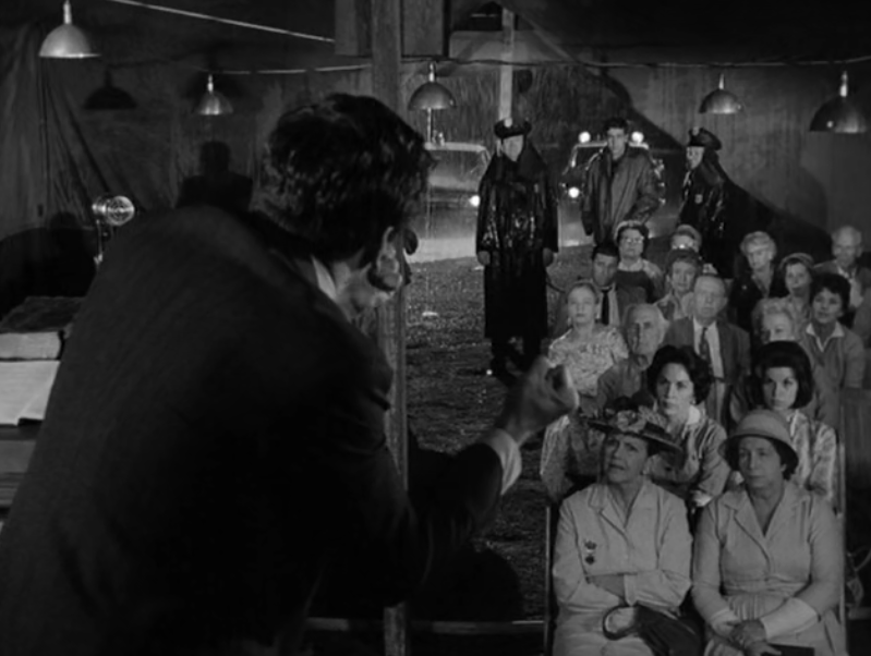 While the old gal, Sister Jem, is out like a light on the balcony in an almost fairytale-like slumber. Lyn Murray’s music underscores Gem’s sleep momentarily with an almost childlike lullaby, hinting that her drowse is otherworldly. Sister Pamela and Downey begin a heated dialogue about faith and prayer. And though he wears a classy suit, it cannot disguise his coarse, boorish, and unpolished nature. She rebukes him – “Prayers aren’t business deals.” Still, his words strike at the heart of Sister Pamela’s conflict that she has been living in isolation at the convent in order to hide from the world. Downey is like the serpent’s temptation of Eve, who sows the seed of doubt in Pamela that the convent is not a place of ceremony and service for her but a convenient refuge from life.