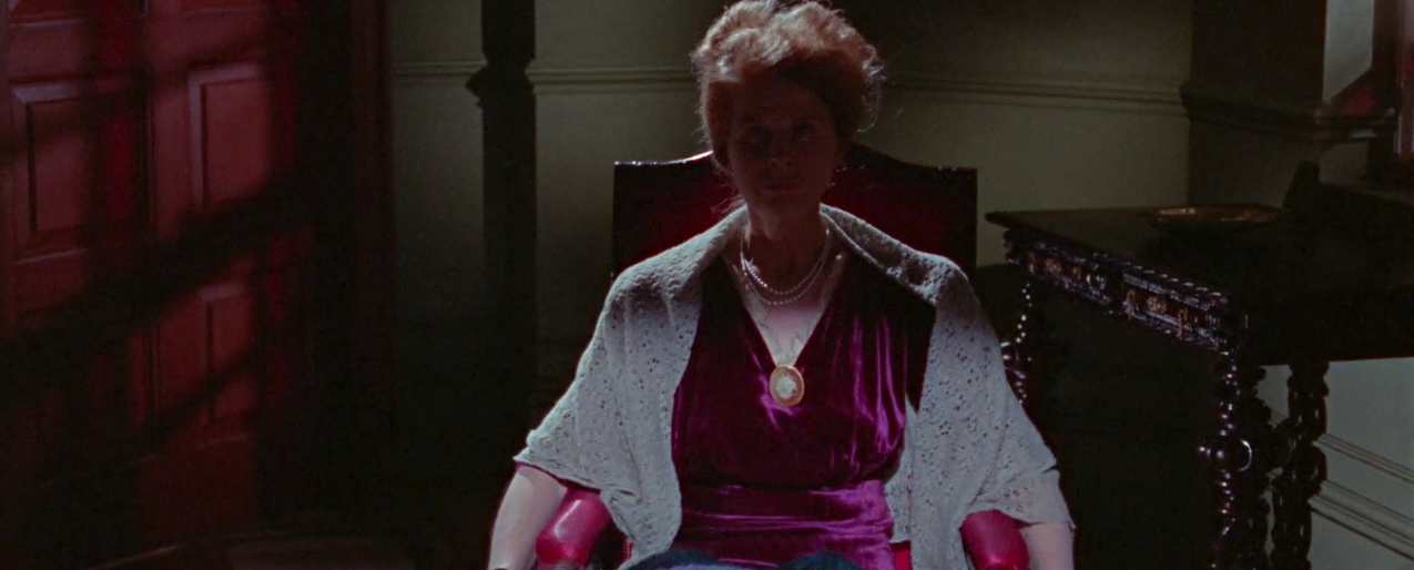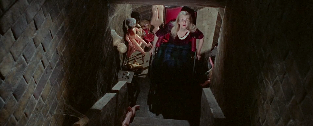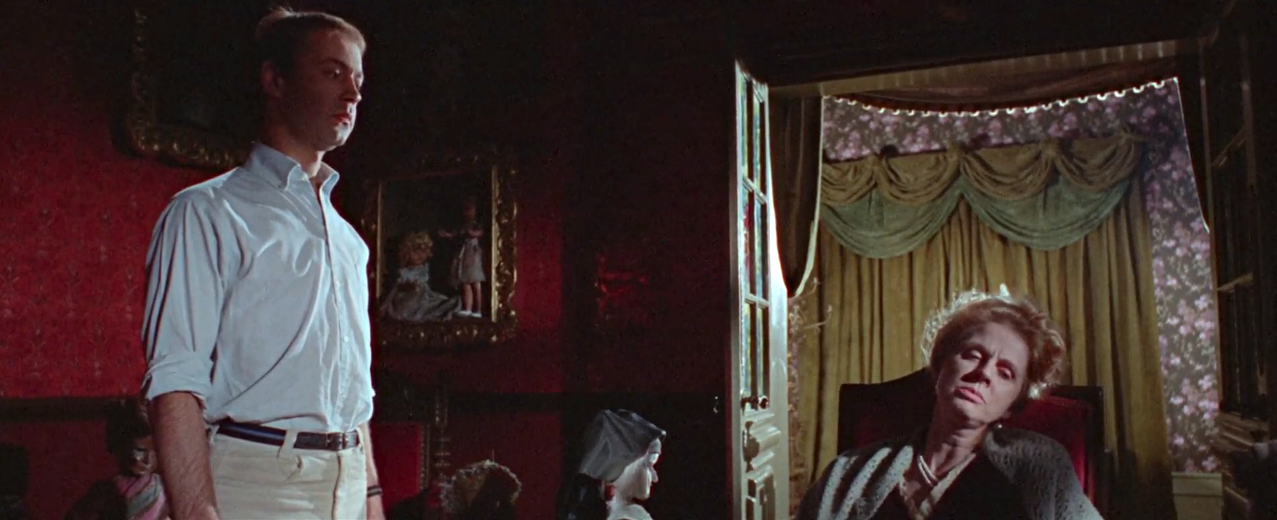 Margaret Johnston takes a flamboyant approach as the wheelchair-bound Ilda Von Sturm, injecting a delightful burst of theatrical flair and delicious threat. Enter the cliché trope of the “Crazy Old Grande Dame Cinema’ that was emerging at that time, conveniently equipped with her red herring wheelchair and a penchant for collecting those damn dolls. She lurks around, growling guttural curses at those who have wronged her family within her dark house lit in deep reds. Like a fairytale witch who creates ritualistic dolls, she emerges from the shadows or contorts Margaret Johnston’s unique face into a quiet scream.
