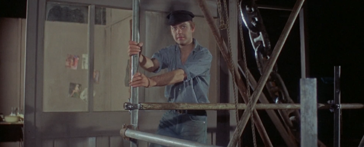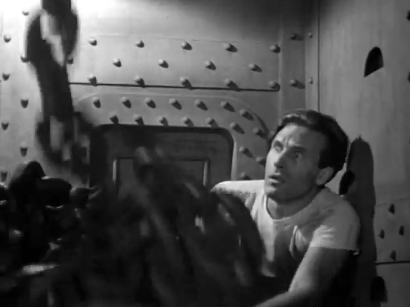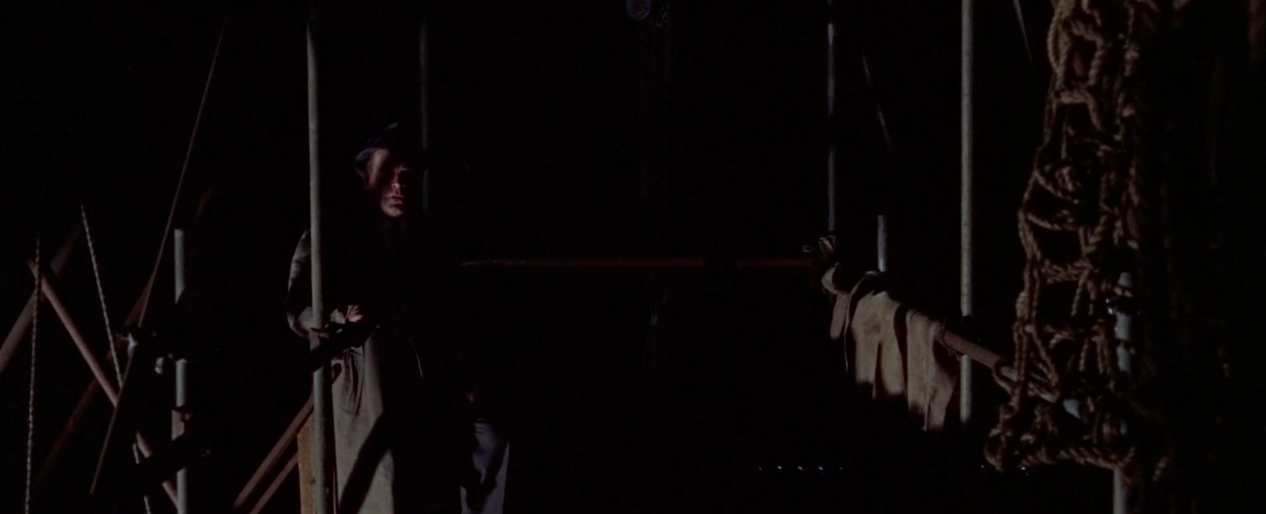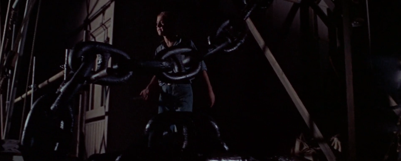 Freddie Francis has a knack for crafting shots that are evocative of burlesque – here it takes center stage, with a few visually captivating moments. For instance, the walk through the creepy dollhouse within the “˜Old Dark House’ setting and the suffocating atmosphere of the gloomy boat factory, where Mark winds up being wrapped around by a giant boa constrictor-like heavy anchor chain that crushes his spine. It is reminiscent of the brutal scene in Lewton’s The Ghost Ship 1943. At the same time, Francis, Oswald Hafenrichter (The Third Man 1949, The Fallen Idol 1948), and cinematographer John Wilcox cut to a plate of spaghetti simultaneously being twisted around a fork. It is a sinister and queasy touch.