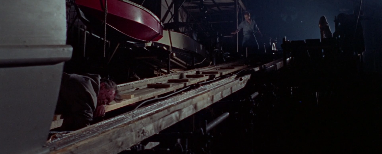 Inspector Holloway pays Mark a visit at the boatyard where he works as a somewhat lackadaisical security guard. A peek into Mark’s shelf of books about ‘abnormal psychology’ at the boatyard hints at Bloch’s fascination with Norman Bates, who had a penchant for collecting a similar study of unsettling literature in his novel. It is also there that Holloway tells Mark that his mother’s doctor has suggested her paralysis is only pathological. Is this a ruse to explain how Mutter Von Sturm can wheel herself across town and break into Saville’s house or facilitate the shocking climax? I’m left wondering.
