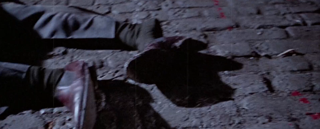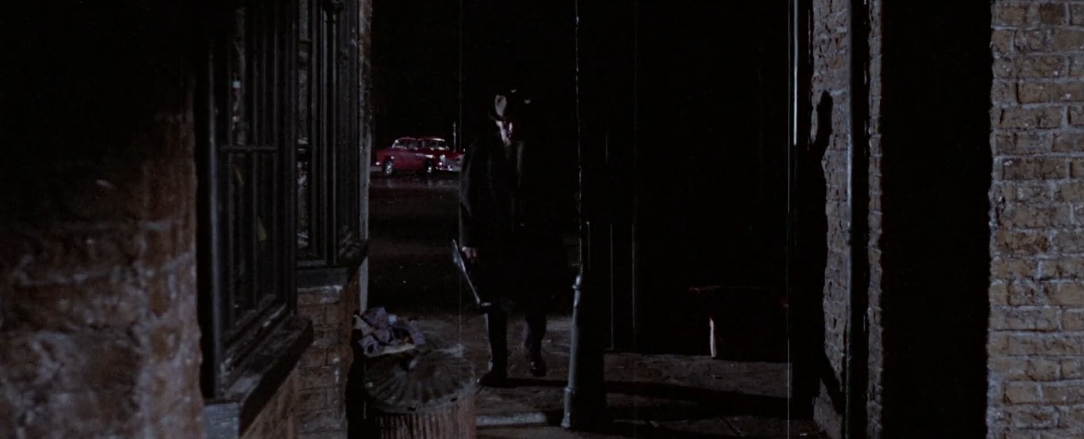 The scarlet sedan follows him slowly down a deserted rainy street. Once he is cornered at a dead end, the car shines its bright headlights, blinding Klermer. The car speeds up and smashes him into the brick wall as Wilcox’s camera delivers his death with a close-up of his eyes. The sound of the engine and the tires moving forward and backward are meticulously timed, causing us to shudder in that tight, dead-end alleyway as Klermer is being crushed under the angry wheels.