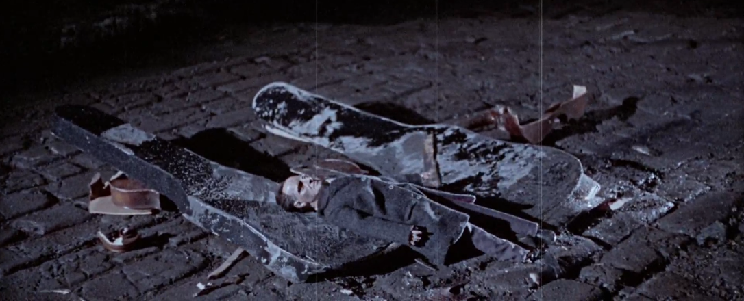 While the sequence doesn’t delve into graphic details, there’s poetic cruelty in the number of times Klermer is pressed under the car’s tires, as the violin he cradled is transformed into splinters beneath the unforgiving wheels. It’s a visually striking metaphor for the obliteration of harmony.