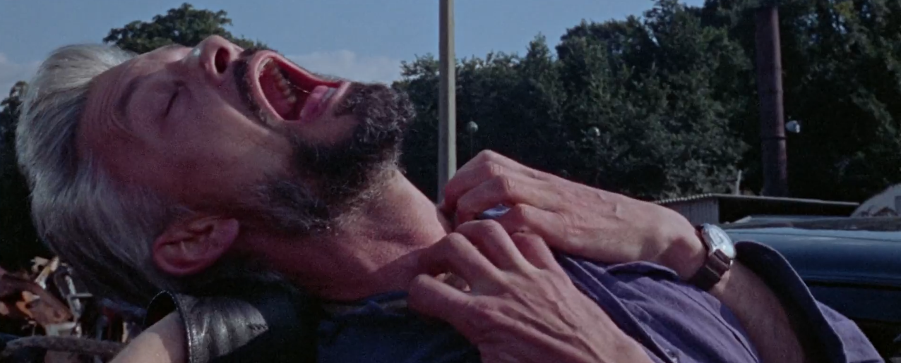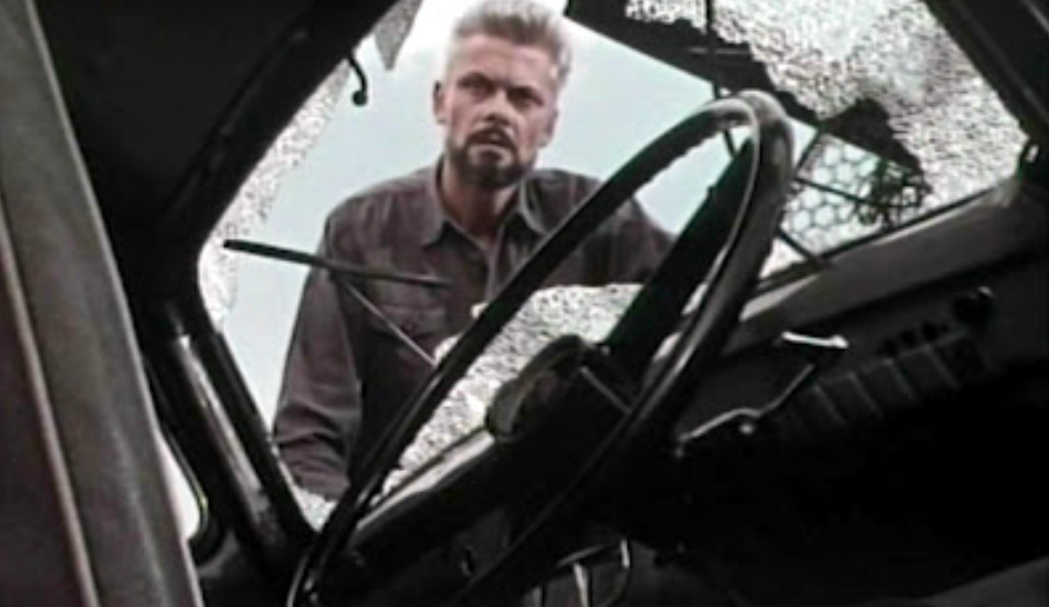 The first over-kill murder unfolds in a drawn-out sequence, with the rhythmic motion of John Wilcox’s camera as it deliberately follows a red Volvo’s window slowly being rolled up after the unseen driver has flattened the tire of the victim Klermer’s automobile. The vehicle’s tires execute a symphony of tread marks. But this killer isn’t just satisfied with a hit-and-run crescendo.