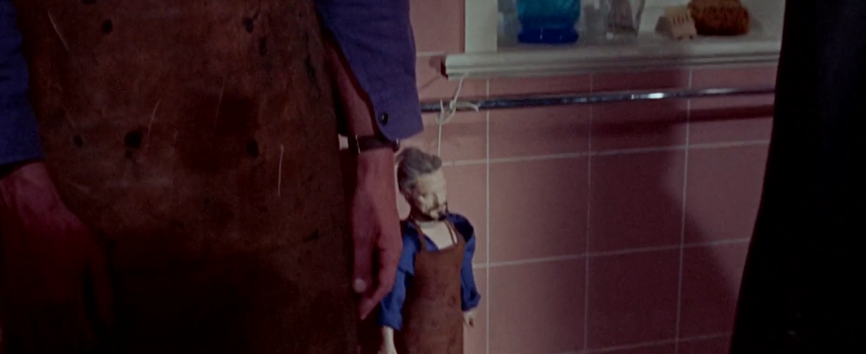 Later the silver-haired Satyr-like goatee sporting Victor Ledoux (Robert Crewdson) is stalked by a disembodied noose through the eerie expanse of a grungy junkyard in the daylight hours. With cheeky flourish, Ledoux’s lifeless body is left with his doll hanging by a tiny noose.