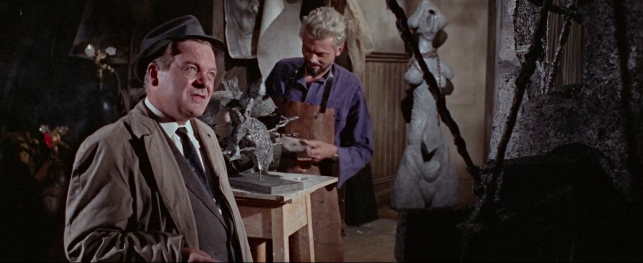 There is also the murder scene involving a blowtorch at Ledoux’s sculptor’s art studio filled with the contorted echoes of the sculptor’s unfinished dance with form and forge looming like eerie artworks in progress. Like Von Sturm’s society of creepy dolls, Ledoux’s studio showcases a landscape of morbid metal figures. The scene is lit very much in neon primary colors that evoke the early works of Mario Bava.